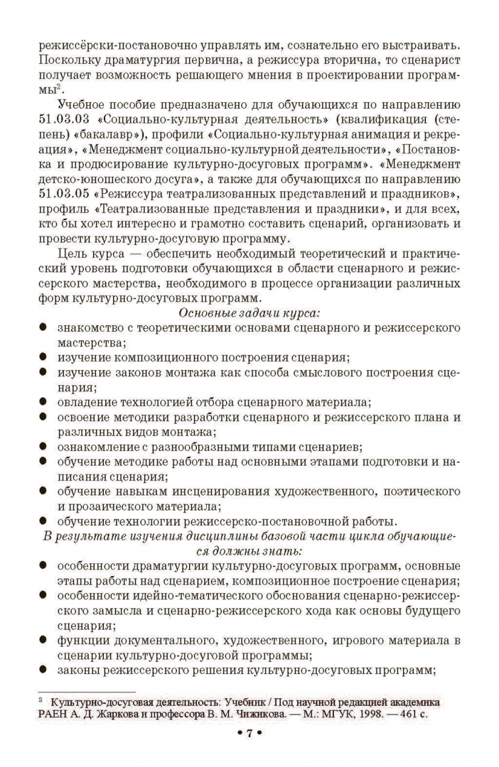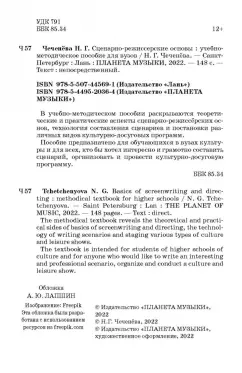 ОписаниеВ учебно-методическом пособии раскрываются теоретические и практические аспекты сценарно-режиссёрских основ, технология составления сценариев и постановки различных видов культурно-досуговых программ.Пособие предназначено для обучающихся в вузах культуры и для всех, кто бы хотел интересно и грамотно составить сценарий, организовать и провести культурно-досуговую программу.В учебно-методическом пособии раскрываются теоретические и практические аспекты сценарно-режиссёрских основ, технология составления сценариев и постановки различных видов культурно-досуговых программ.Пособие предназначено для обучающихся в вузах культуры и для всех, кто бы хотел интересно и грамотно составить сценарий, организовать и провести культурно-досуговую программу.