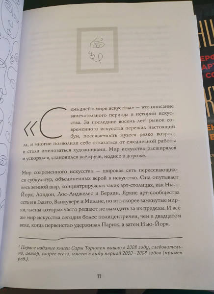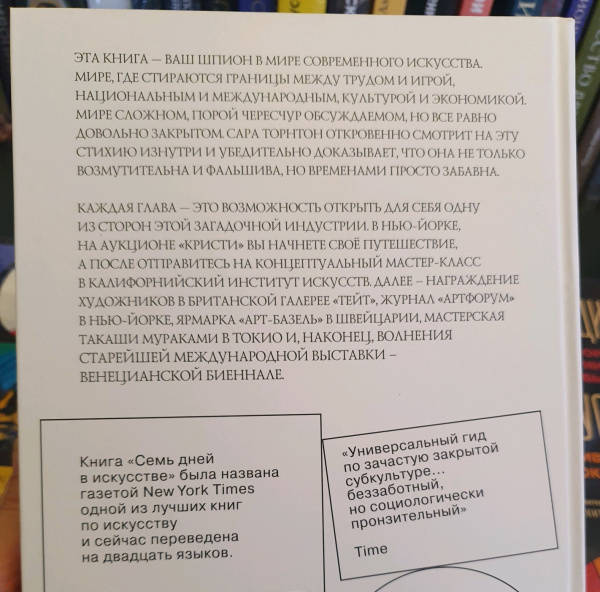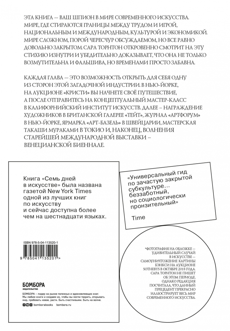 ОписаниеКак писал журнал Vogue, эта книга - "исключительный портрет причудливого мира". Сара Торнтон, ее автор, проводит день в нью-йоркском отделении Christie's, одного из трех крупных аукционных домов, способных за один вечер продать произведения искусства за десятки миллионов долларов; посещает критическую сессию в CalArts, где будущие художники узнают, как отвлечь свои мыслительные процессы от реального мира; день открытия Венецианской биеннале и четыре других встречи со сценой современного искусства. Благодаря такому вовлечению автора в процессы современного искусства создается целостное описание социальных и культурных миров. И вот перед нами уникальное исследование, которое выходит за рамки анализа современного искусства и описывает целый новый мир, в котором мы теперь живем.Умело пользуясь приемами наблюдения, внимательного слушания, интервью и анализа документов, автор делает свой рассказ действительно интересным.Как писал журнал Vogue, эта книга - "исключительный портрет причудливого мира". Сара Торнтон, ее автор, проводит день в нью-йоркском отделении Christie's, одного из трех крупных аукционных домов, способных за один вечер продать произведения искусства за десятки миллионов долларов; посещает критическую сессию в CalArts, где будущие художники узнают, как отвлечь свои мыслительные процессы от реального мира; день открытия Венецианской биеннале и четыре других встречи со сценой современного искусства. Благодаря такому вовлечению автора в процессы современного искусства создается целостное описание социальных и культурных миров. И вот перед нами уникальное исследование, которое выходит за рамки анализа современного искусства и описывает целый новый мир, в котором мы теперь живем.Умело пользуясь приемами наблюдения, внимательного слушания, интервью и анализа документов, автор делает свой рассказ действительно интересным.