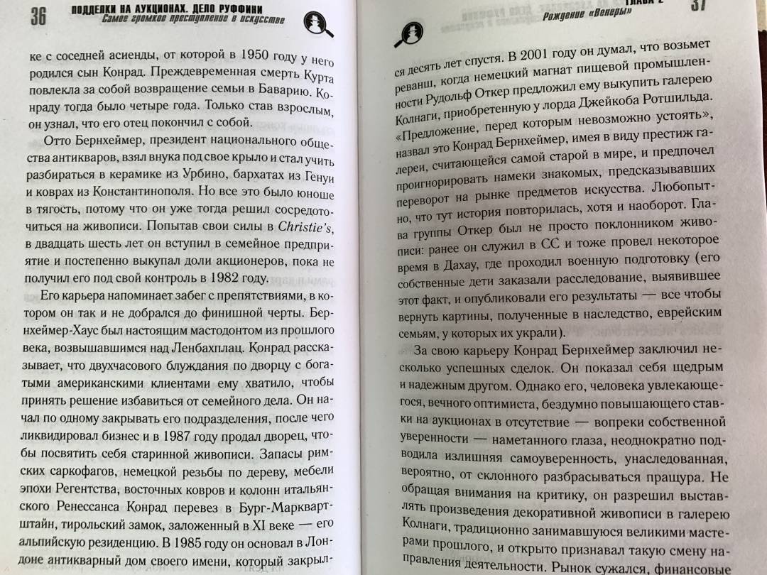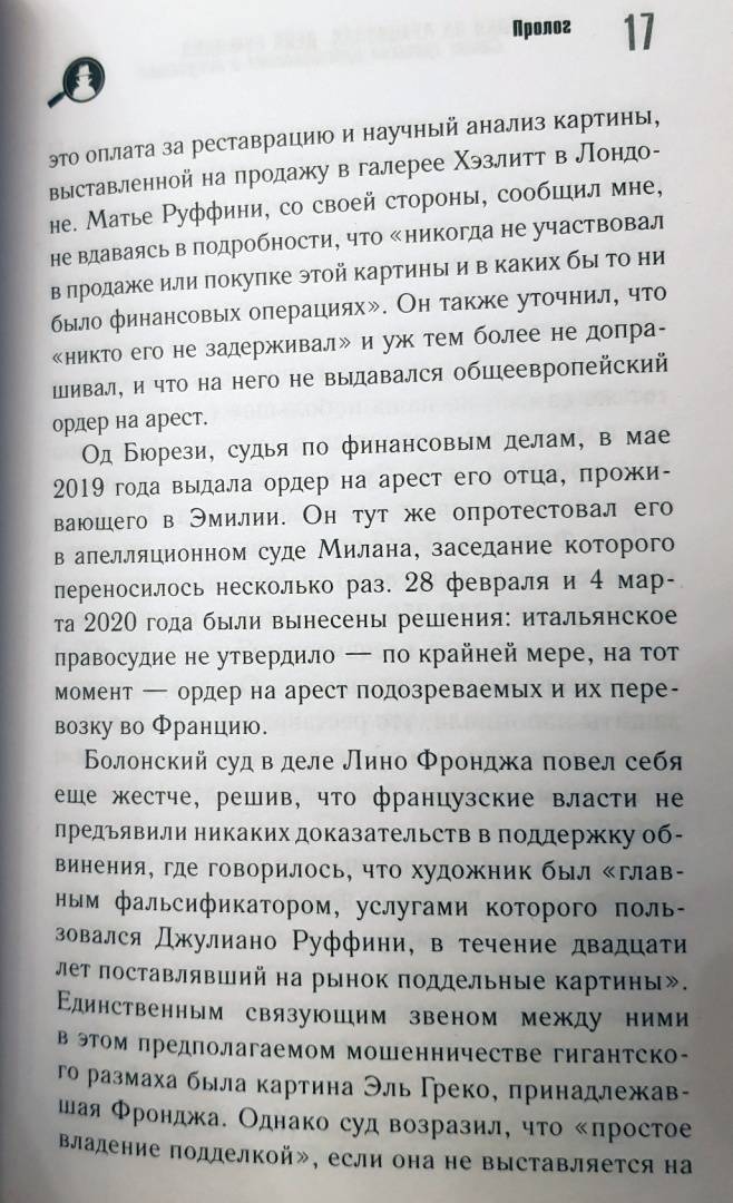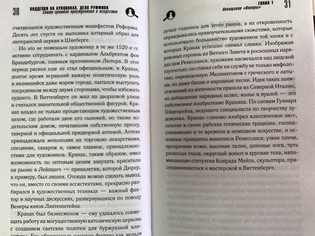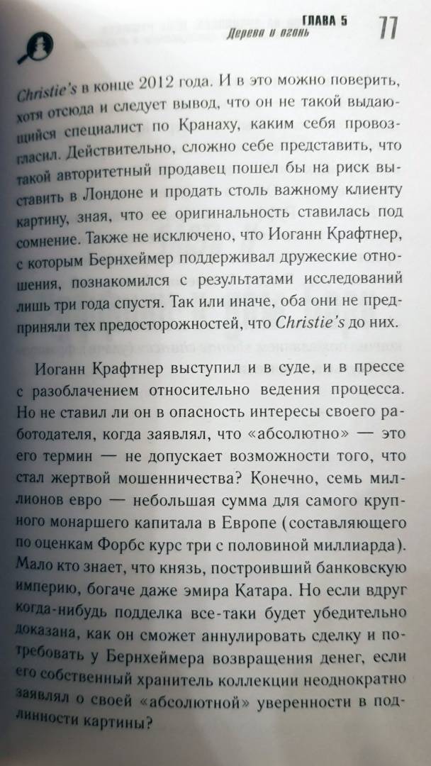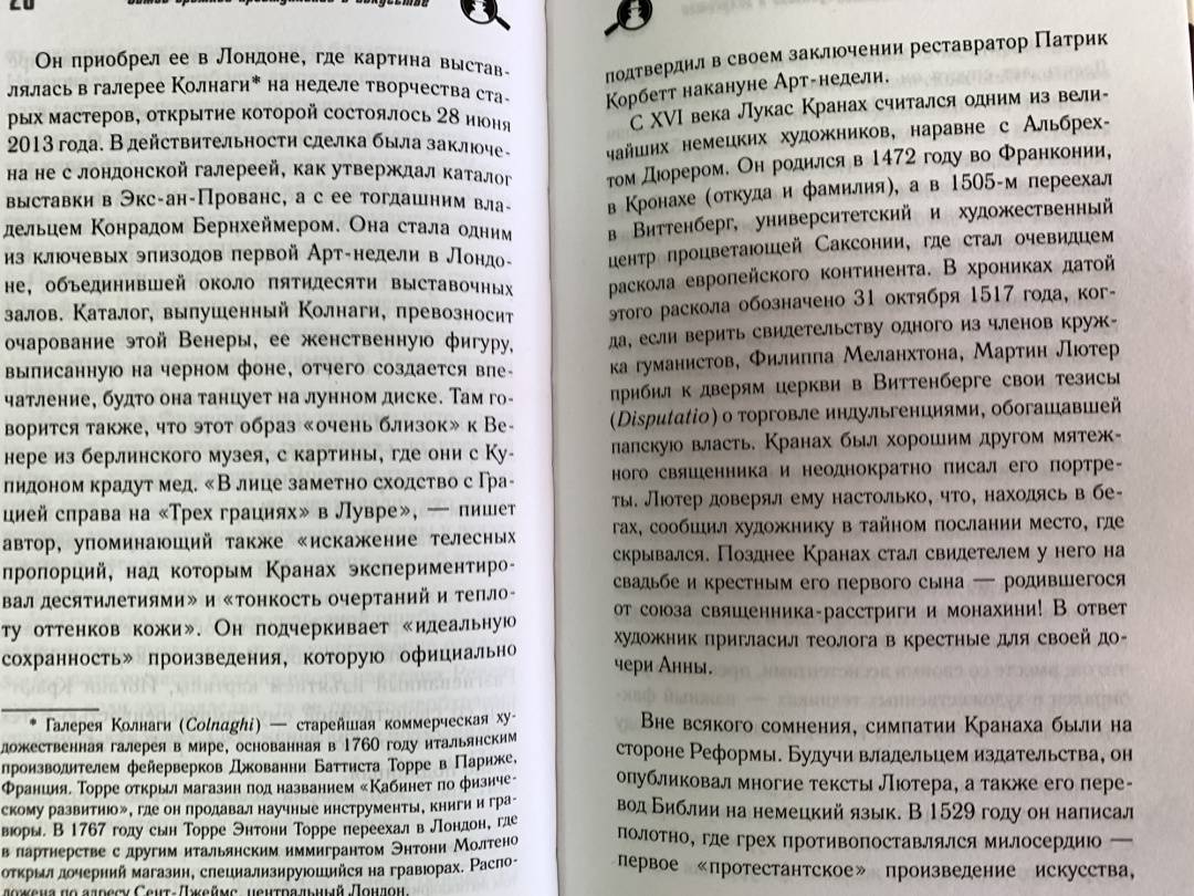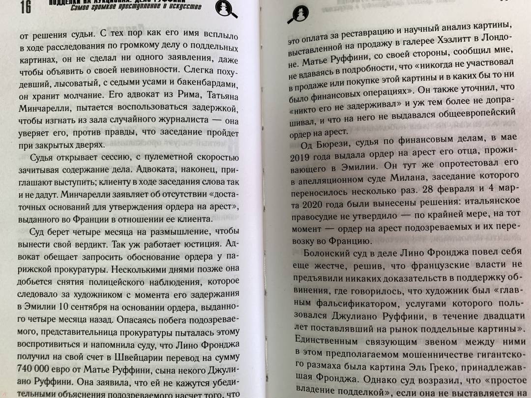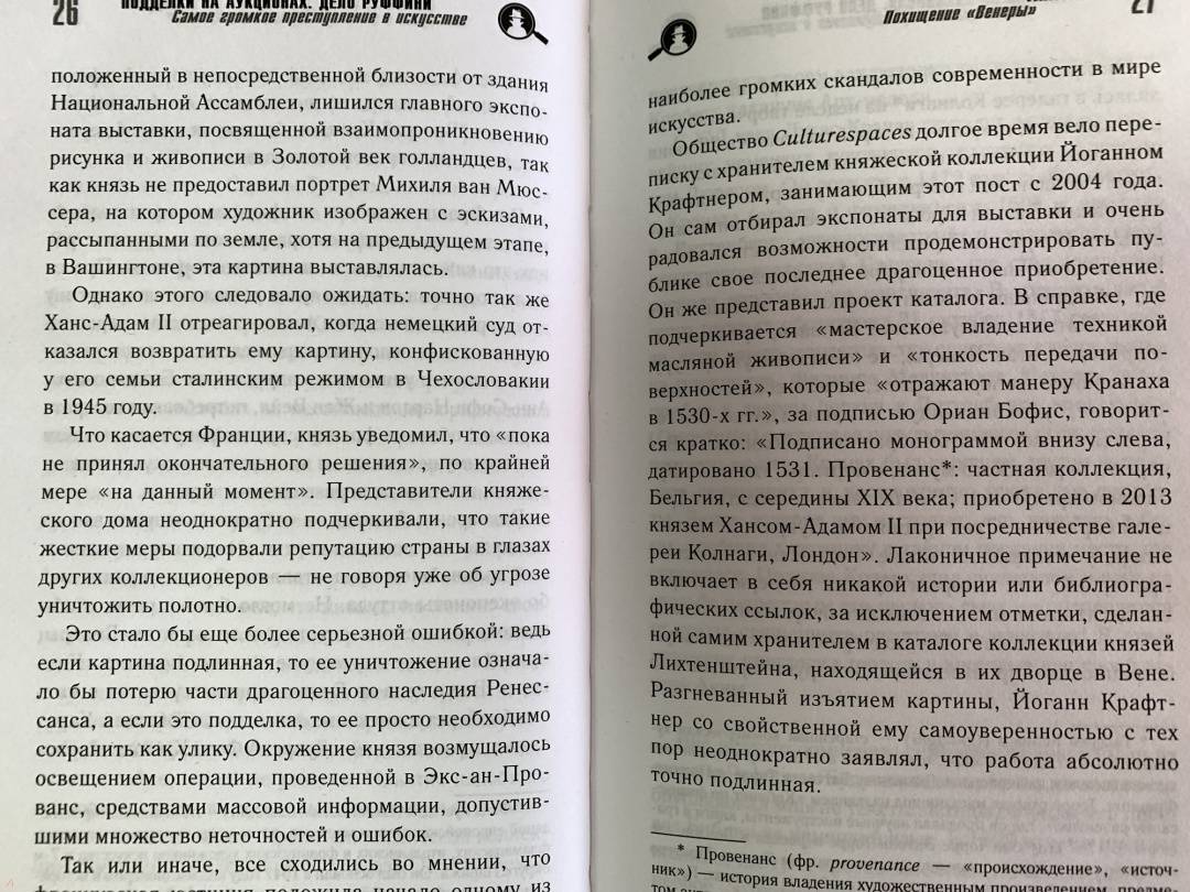 ОписаниеРынки произведений искусства привлекают самых разных людей. Есть просто шутники, которые дурачат авторитетных искусствоведов, чтобы просто развлечься. Встречаются жулики, которые вообще не имеют отношения к искусству, но хотят выступать в роли великих мастеров. А есть известные арт-дилеры, которые сознательно строят карьеру на изготовлении поддельных произведений или фальшивых сертификатов подлинности и вводят в заблуждение известных историков искусства.Изъятие в 2016 году «Венеры с вуалью», приписываемой мастеру эпохи Возрождения Лукасу Кранаху, из коллекции принца Лихтенштейна вызвало скандал, которого никогда не было в мире искусства. Эта почти детективная история – результат пяти лет расследования, начавшегося с момента, когда первый, а потом второй свидетель пришли побеседовать с автором книги – известным журналистом ежемесячника The Art Newspaper, Винсентом Носе и рассказать о своих невероятных приключениях в закулисье арт-рынка, где заключаются миллионные сделки, плетутся интриги, случаются молниеносные падения и головокружительные взлеты. Лувр, Национальная Галерея в Лондоне, музей Метрополитен в Нью-Йорке, Музей истории искусства в Вене, Национальный музей в Парме, отделения «Sotheby’s» и «Christie’s» в Париже, Лондоне и Нью-Йорке, многие престижные галереи Лондона и Парижа, не считая различных экспертов из Европы и США оказались замешаны в разразившемся скандале – естественно, против своей воли. Юридические процедуры проводились в Париже, Нью-Йорке, Лондоне и Милане. Несмотря на различные заявления, сделанные в ходе расследования, ни один из участников событий до сих пор не был осужден.В течение пяти лет, путешествуя по Франции, Италии, Соединенному Королевству и Соединенным Штатам, Винсент Носе исследует происхождение этих картин, и именно так он встречает человека, удаленного в Эмилию, Джулиано Руффини. Он заявляет о своей невиновности, подвергая сомнению выводы торговцев, экспертов, кураторов и искусствоведов. Правда ? Неправда ? Каждый из главных героев раскрывает свою долю правды в захватывающем деле, которое потрясает все основы рынка и истории искусства.информация, и в том, что его отголоски распространятся по всей планете. Одна за другой картины проходят под микроскопами американских и европейских лабораторий. Блестящие подделки талантливого жулика? Подлинные шедевры прошлого? Или просто старинные копии?СвернутьРынки произведений искусства привлекают самых разных людей. Есть просто шутники, которые дурачат авторитетных искусствоведов, чтобы просто развлечься. Встречаются жулики, которые вообще не имеют отношения к искусству, но хотят выступать в роли великих мастеров. А есть известные арт-дилеры, которые сознательно строят карьеру на изготовлении поддельных произведений или фальшивых сертификатов подлинности и вводят в заблуждение известных историков искусства.Изъятие в 2016 году «Венеры с вуалью», приписываемой мастеру эпохи Возрождения Лукасу Кранаху, из коллекции принца Лихтенштейна вызвало скандал, которого никогда не было в мире искусства. Эта почти детективная история – результат пяти лет расследования, начавшегося с момента, когда первый, а потом второй свидетель пришли побеседовать с автором книги – известным журналистом ежемесячника The Art Newspaper, Винсентом Носе и рассказать о сво