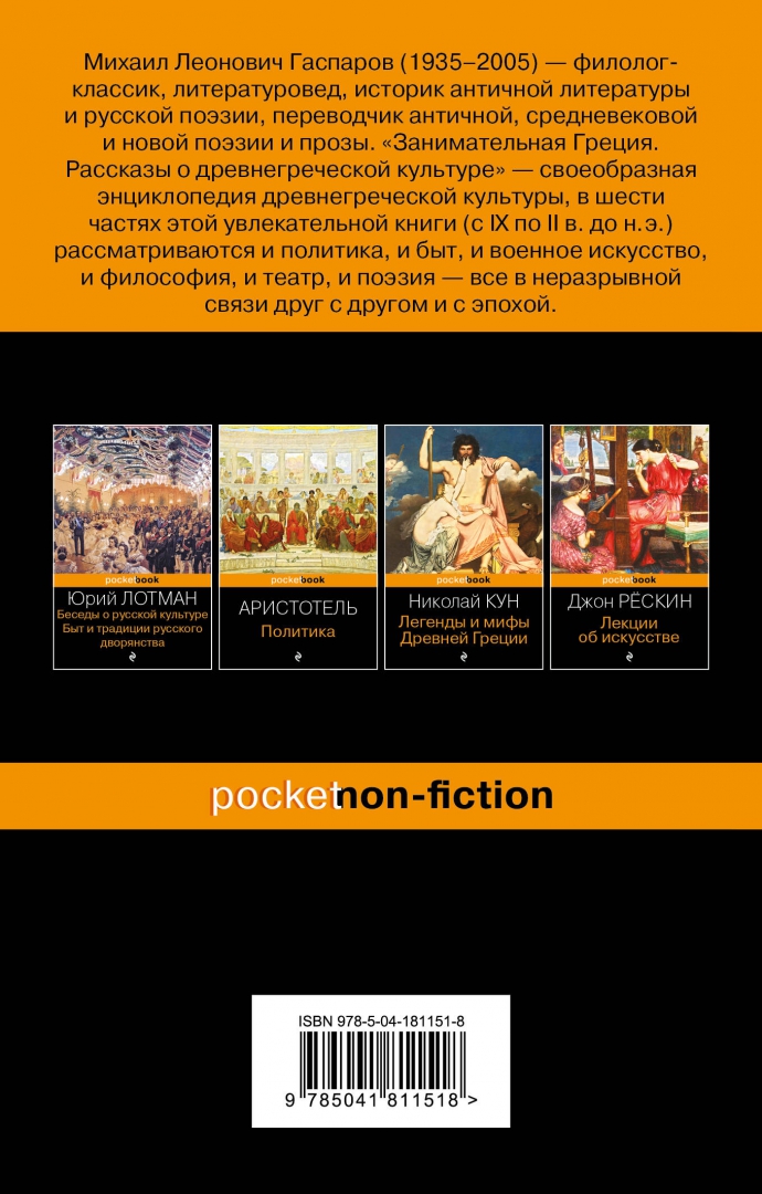 Объем, стр. 528 ISBN 978-5-04-181151-8 Автор Гаспаров Михаил Леонович Серия Pocket book. Non-fiction Масса 1010 г Размеры 218x180x50 мм Язык Русский Минимальный возраст 16+ Год издания книги 2023 Тип обложки Мягкий переплет Иллюстрации Черно-белые Вес, г 262г Размеры 185х120х22 мм - Отзывы