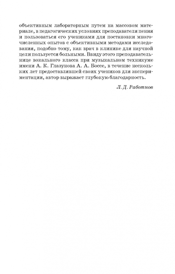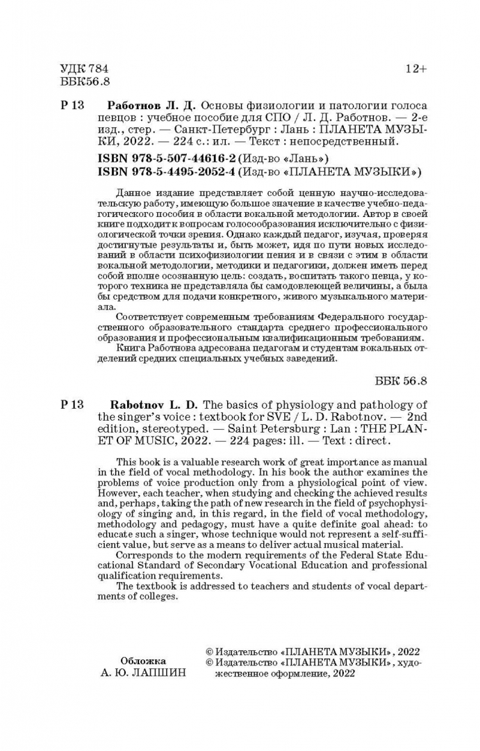 ОписаниеДанное издание представляет собой ценную научно-исследовательскую работу, имеющую большое значение в качестве учебно-педагогического пособия в области вокальной методологии. Автор в своей книге подходит к вопросам голосообразования исключительно с физиологической точки зрения. Однако каждый педагог, изучая, проверяя достигнутые результаты и, быть может, идя по пути новых исследований в области психофизиологии пения и в связи с этим в области вокальной методологии, методики и педагогики, должен иметь перед собой вполне осознанную цель: создать, воспитать такого певца, у которого техника не представляла бы самодовлеющей величины, а была бы средством для подачи конкретного, живого музыкального материала.Книга Работнова адресована педагогам и студентам вокальных отделений средних специальных учебных заведений.2-е издание, стереотипное.Данное издание представляет собой ценную научно-исследовательскую работу, имеющую большое значение в качестве учебно-педагогического пособия в области вокальной методологии. Автор в своей книге подходит к вопросам голосообразования исключительно с физиологической точки зрения. Однако каждый педагог, изучая, проверяя достигнутые результаты и, быть может, идя по пути новых исследований в области психофизиологии пения и в связи с этим в области вокальной методологии, методики и педагогики, должен иметь перед собой вполне осознанную цель: создать, воспитать такого певца, у которого техника не представляла бы самодовлеющей величины, а была бы средством для подачи конкретного, живого музыкального материала.Книга Работнова адресована педагогам и студентам вокальных отделений средних специальных учебных заведений.2-е издание, стереотипное.