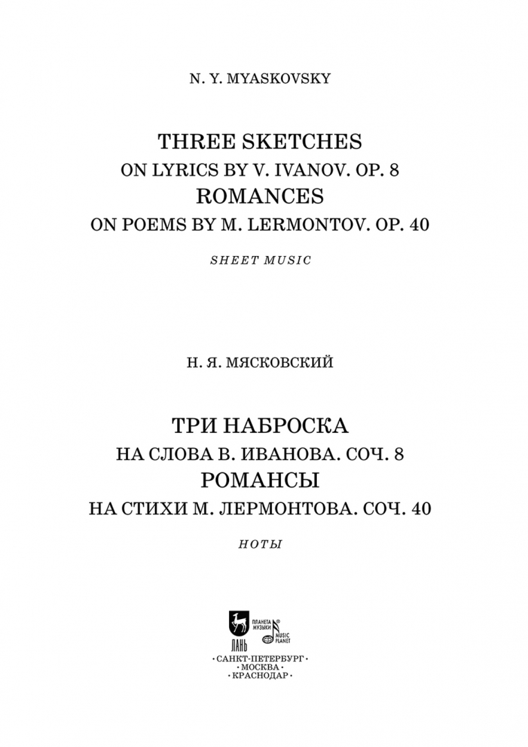 ОписаниеНиколай Яковлевич Мясковский (1881-1950) оставил обширное наследие, в котором не последнее место занимают романсы (более 100). К этому жанру композитор обращался на протяжении всего творческого пути. По словам Б. Асафьева, в романсах, «как в лаборатории его творчества, можно как нельзя лучше наблюдать трансформацию элементов языка, процесс оформления и эволюцию композиторского мышления». В сборник вошли "Три наброска" на слова В. И. Иванова соч. 8 и Романсы на стихи М. Ю. Лермонтова соч. 40. Издание адресовано профессиональным исполнителям и любителям вокальной музыки.Николай Яковлевич Мясковский (1881-1950) оставил обширное наследие, в котором не последнее место занимают романсы (более 100). К этому жанру композитор обращался на протяжении всего творческого пути. По словам Б. Асафьева, в романсах, «как в лаборатории его творчества, можно как нельзя лучше наблюдать трансформацию элементов языка, процесс оформления и эволюцию композиторского мышления». В сборник вошли "Три наброска" на слова В. И. Иванова соч. 8 и Романсы на стихи М. Ю. Лермонтова соч. 40. Издание адресовано профессиональным исполнителям и любителям вокальной музыки.
