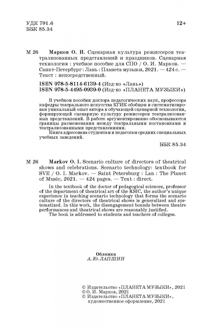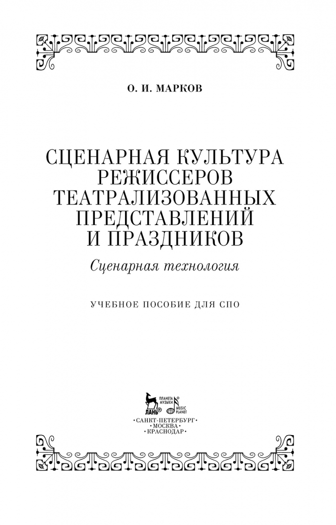 --Олег Марков: Сценарная культура режиссеров театрализованных представлений и праздников. Сценарная технологияХобби и развлечения. Организация досуга. ПесенникиИскусство. Культура. Музыка. Театр. КиноТуризм. Путешествие. Страноведение(Краеведение)Путеводители.Атласы дорог.КартыПутевые очерки. Рассказы путешественников и натуралистовОхота. Рыбалка. СобирательствоРастениеводствоКоллекционированиеТуризм. Путеводители. ТранспортРазвлечения. ПраздникиРемонт. Строительство. ИнтерьерДомашние ремесла. РукоделиеУход за животнымиФитнес. Спорт. СамооборонаКулинарияКультура. ИскусствоДомоводство