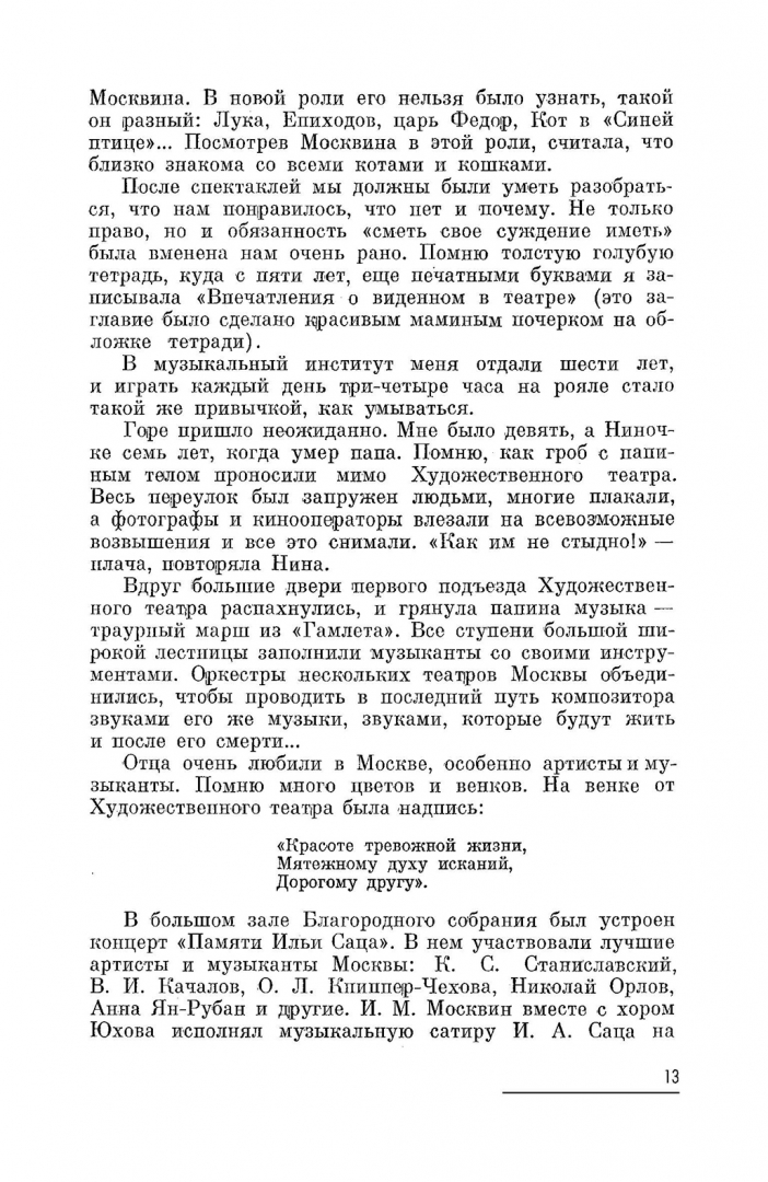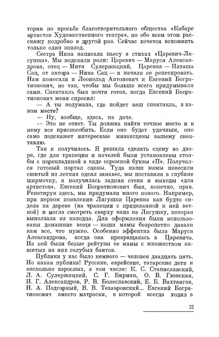 ОписаниеНаталия Ильинична Сац со всей правдивостью рассказывает о себе, о своих детских театральных впечатлениях, о встречах со многими примечательными и знаменитыми людьми и главное преимущественно — о деле своей жизни, которому она отдавалась горячо и преданно,- о создании театра для детей. Единая целеустремленность Н. И. Сац нашла исчерпывающее отражение в ее стремительных поисках, в ее всепоглощающей любви к детям и к тому новому явлению искусства — театру для детей, инициатором которого она явилась. Книга адресована искусствоведам, историкам театра, а также широкому кругу читателей, которые смогут узнать о становлении детского театра, о насущных проблемах, с ним связанных, и познакомиться с автором книги — инетересной и смелой творческой личностью, своей деятельностью внесшей много ценного в историю советского театра.2-е издание, стереотипное.Наталия Ильинична Сац со всей правдивостью рассказывает о себе, о своих детских театральных впечатлениях, о встречах со многими примечательными и знаменитыми людьми и главное преимущественно — о деле своей жизни, которому она отдавалась горячо и преданно,- о создании театра для детей. Единая целеустремленность Н. И. Сац нашла исчерпывающее отражение в ее стремительных поисках, в ее всепоглощающей любви к детям и к тому новому явлению искусства — театру для детей, инициатором которого она явилась. Книга адресована искусствоведам, историкам театра, а также широкому кругу читателей, которые смогут узнать о становлении детского театра, о насущных проблемах, с ним связанных, и познакомиться с автором книги — инетересной и смелой творческой личностью, своей деятельностью внесшей много ценного в историю советского театра.2-е издание, стереотипное.