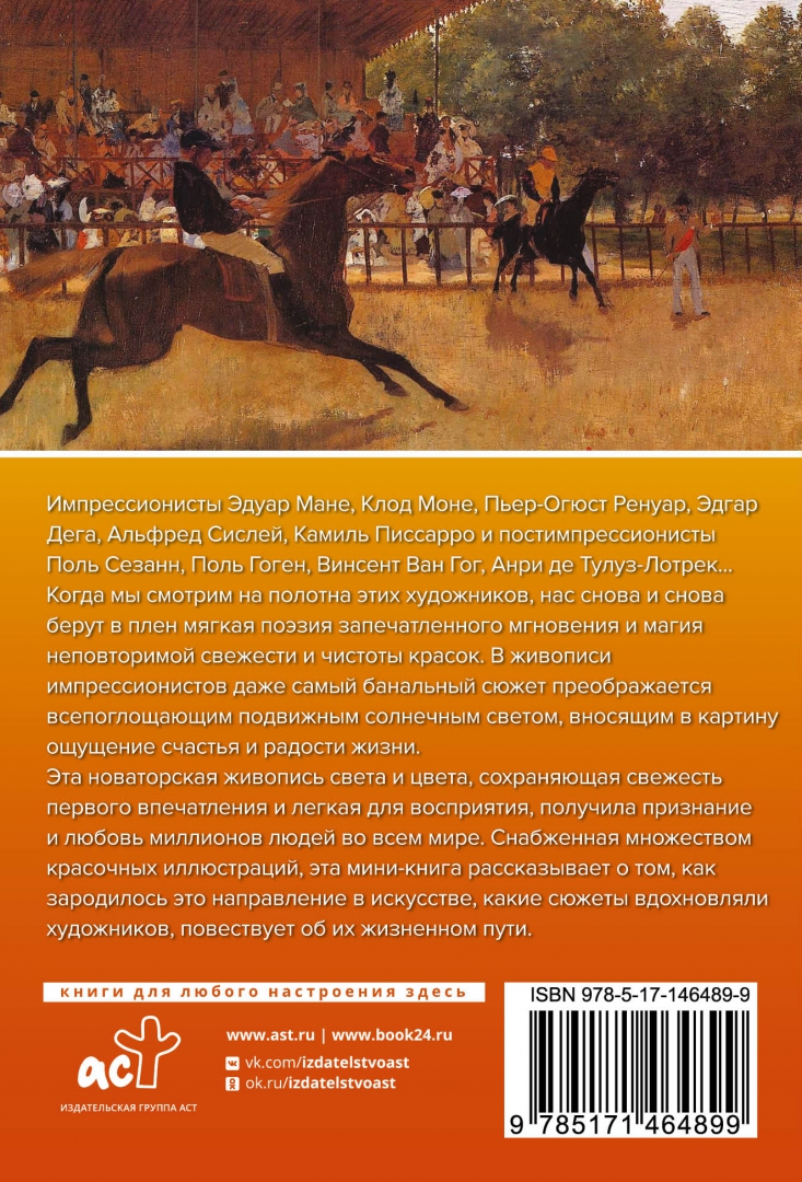 ОписаниеИмпрессионисты Эдуар Мане, Клод Моне, Пьер-Огюст Ренуар, Эдгар Дега, Альфред Сислей, Камиль Писсарро, Берта Моризо, Мэри Кассат…Когда мы смотрим на полотна этих художников, нас снова и снова берут в плен мягкая поэзия запечатленного мгновения и магия неповторимой свежести и чистоты красок. В живописи импрессионистов даже самый банальный сюжет преображается всепоглощающим подвижным солнечным светом, вносящим в картину ощущение счастья и радости жизни.Эта новаторская живопись света и цвета, сохраняющая свежесть первого впечатления и легкая для восприятия, получила признание и любовь миллионов людей во всем мире. Снабженная множеством красочных иллюстраций, этот мини-альбом рассказывает о том, как зародилось это направление в искусстве, какие сюжеты вдохновляли художников, повествует об их жизненном пути, а также рассказывает о творчестве художников постимпрессионистов, так или иначе попавших под влияние импрессионистов: Поле Гогене, Поле Сезанне, Винсенте Ван Гоге.Импрессионисты Эдуар Мане, Клод Моне, Пьер-Огюст Ренуар, Эдгар Дега, Альфред Сислей, Камиль Писсарро, Берта Моризо, Мэри Кассат…Когда мы смотрим на полотна этих художников, нас снова и снова берут в плен мягкая поэзия запечатленного мгновения и магия неповторимой свежести и чистоты красок. В живописи импрессионистов даже самый банальный сюжет преображается всепоглощающим подвижным солнечным светом, вносящим в картину ощущение счастья и радости жизни.Эта новаторская живопись света и цвета, сохраняющая свежесть первого впечатления и легкая для восприятия, получила признание и любовь миллионов людей во всем мире. Снабженная множеством красочных иллюстраций, этот мини-альбом рассказывает о том, как зародилось это направление в искусстве, какие сюжеты вдохновляли художников, повествует об их жизненном пути, а также рассказывает о творчестве художников постимпрессионистов, так или иначе попавших под влияние импрессионистов: Поле Гогене, Поле Сезанне, Винсенте Ван Гоге.