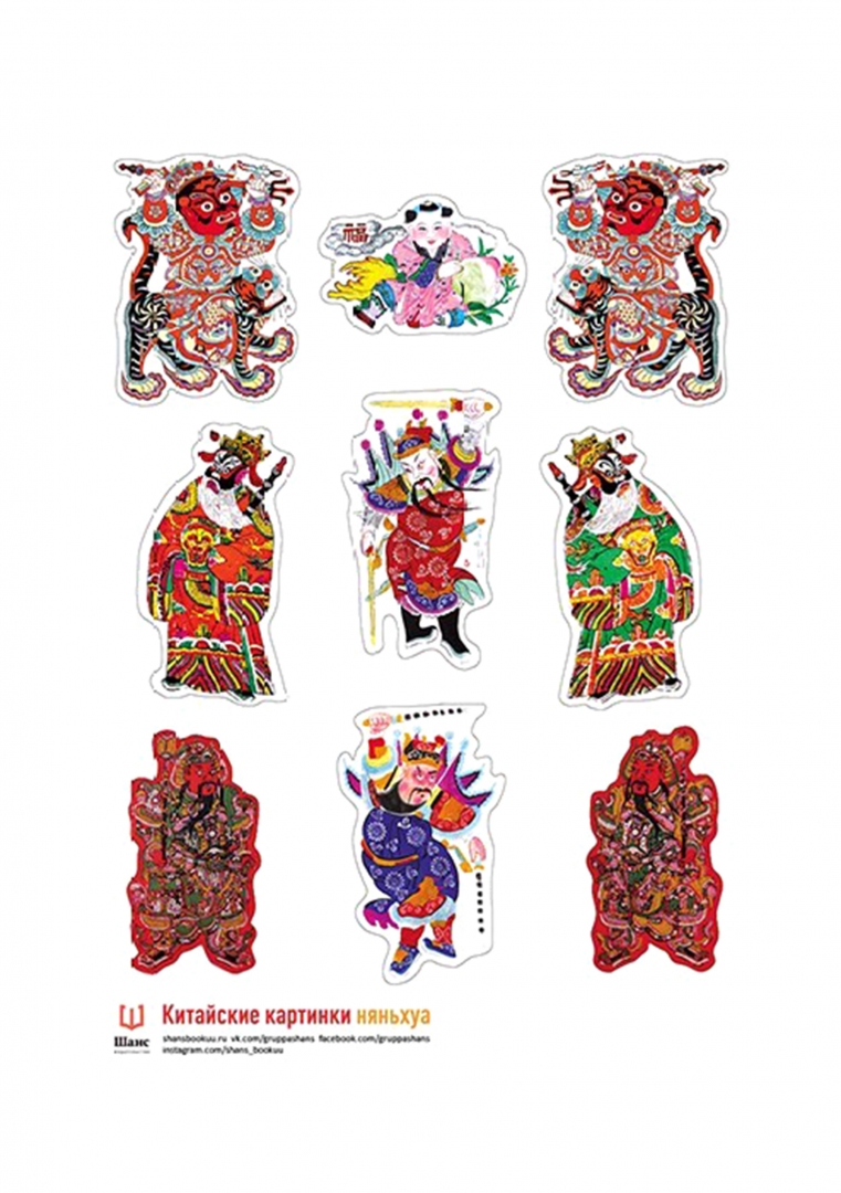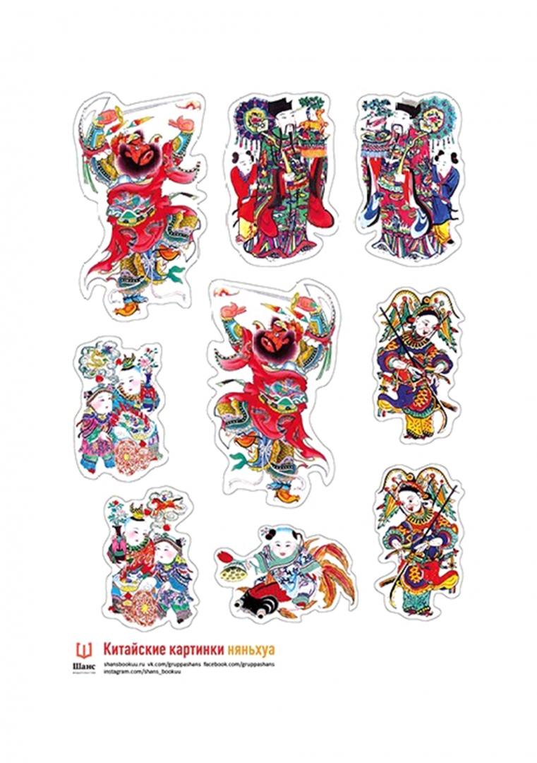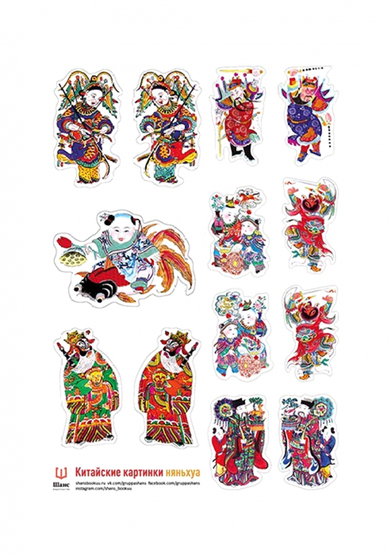 ОписаниеКитайские новогодние картинки, или няньхуа, — это особый вид народного искусства. С древних времен они служат непременным элементом новогодних украшений в Китае. Из книги Тай Гаоди вы узнаете все о возникновении и развитии жанра няньхуа, увидите самые разнообразные формы этих картинок и даже познакомитесь с технологией их изготовления. А многочисленные примечания в книге поведают много интересного об истории и культуре Поднебесной страны. Для широкого круга читателей.Набор наклеек с китайскими картинками Няньхуа.В старом Китае в канун Нового года в домах крестьян и горожан развешивали дешевые картины, которые в XIX веке получили название няньхуа - новогодние. Они выполнялись в мастерских в технике ксилографии с раскраской от руки или в цветной печати. Картина няньхуа прошла долгий путь развития: от дешевых печатных икон, изготовлявшихся в буддийских и даосских монастырях в V -VI веках, до полнокровного народного искусства, сформировавшегося в первой половине XIX века.Китайские новогодние картинки, или няньхуа, — это особый вид народного искусства. С древних времен они служат непременным элементом новогодних украшений в Китае. Из книги Тай Гаоди вы узнаете все о возникновении и развитии жанра няньхуа, увидите самые разнообразные формы этих картинок и даже познакомитесь с технологией их изготовления. А многочисленные примечания в книге поведают много интересного об истории и культуре Поднебесной страны. Для широкого круга читателей.Набор наклеек с китайскими картинками Няньхуа.В старом Китае в канун Нового года в домах крестьян и горожан развешивали дешевые картины, которые в XIX веке получили название няньхуа - новогодние. Они выполнялись в мастерских в технике ксилографии с раскраской от руки или в цветной печати. Картина няньхуа прошла долгий путь развития: от дешевых печатных икон, изготовлявшихся в буддийских и даосских монастырях в V -VI веках, до полнокровного народного искусства, сформировавшегося в первой половине XIX века.