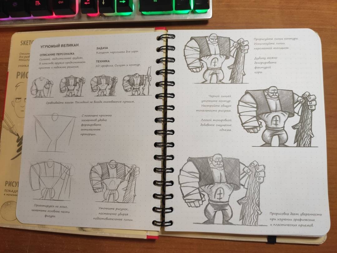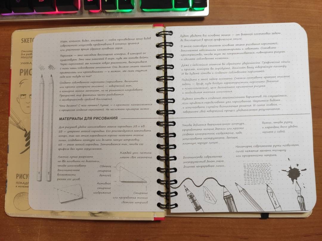 ОписаниеСкетчбук - это настоящая находка для творческих людей, которые видят в окружающем мире только прекрасное! Он может служить одновременно и учебником для рисования, и тетрадью для записей и рисунков, ведь на его страницах есть и упражнения для начинающих художников, и пространство для собственных креативных идей. Удобный корешок на пружине позволяет повернуть блокнот на 360 градусов и использовать в качестве планшета, чтобы записывать и зарисовывать прямо на ходу. А через белую плотную бумагу не проступает краска, благодаря чему вы можете не волноваться за сохранность своих рисунков.Делайте заметки, планируйте задачи, записывайте лекции - и рисуйте рядом: с каждой заполненной страницей Sketchbook. Рисуем персонажей: игры, комиксы, анимация" будет становиться все красивее. Идеальный выбор для тех, кто ищет новые формы творческого самовыражения.Скетчбук - это настоящая находка для творческих людей, которые видят в окружающем мире только прекрасное! Он может служить одновременно и учебником для рисования, и тетрадью для записей и рисунков, ведь на его страницах есть и упражнения для начинающих художников, и пространство для собственных креативных идей. Удобный корешок на пружине позволяет повернуть блокнот на 360 градусов и использовать в качестве планшета, чтобы записывать и зарисовывать прямо на ходу. А через белую плотную бумагу не проступает краска, благодаря чему вы можете не волноваться за сохранность своих рисунков.Делайте заметки, планируйте задачи, записывайте лекции - и рисуйте рядом: с каждой заполненной страницей Sketchbook. Рисуем персонажей: игры, комиксы, анимация" будет становиться все красивее. Идеальный выбор для тех, кто ищет новые формы творческого самовыражения.