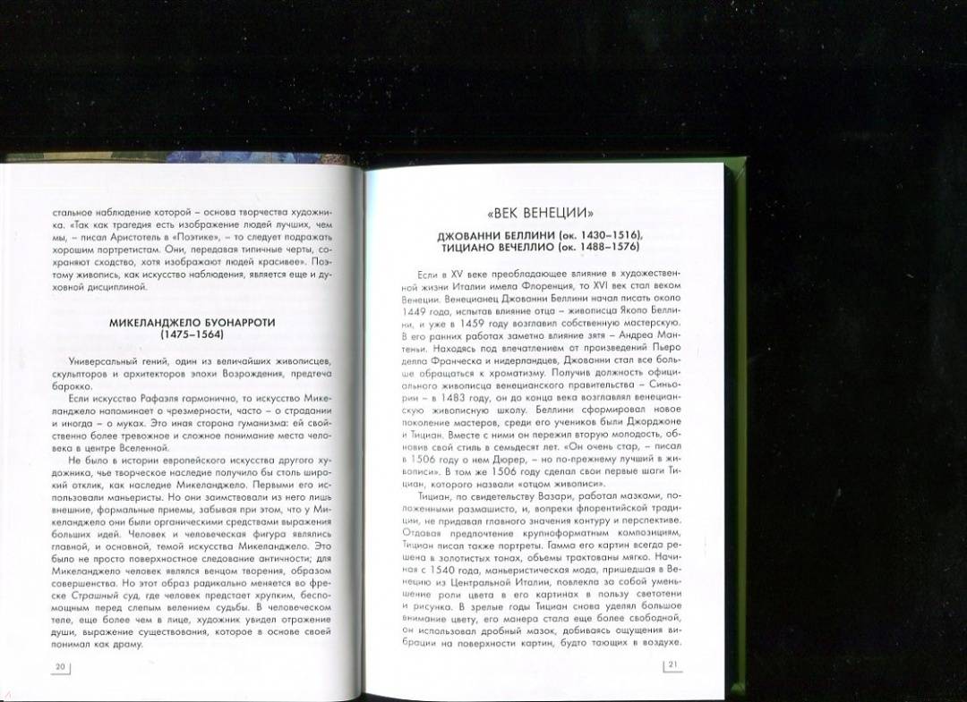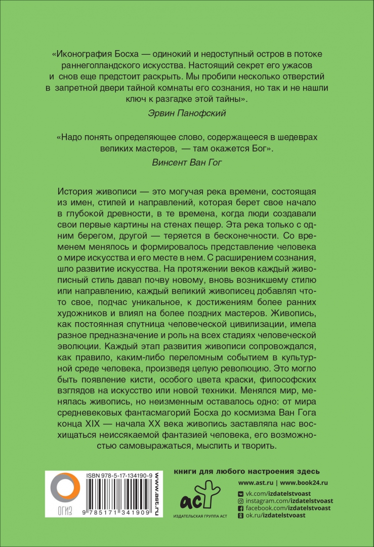 ОписаниеИстория живописи – это могучая река времени, состоящая из имен, стилей и направлений, которая берет свое начало в глубокой древности, в те времена, когда люди создавали свои первые картины на стенах пещер. Эта река только с одним берегом, другой – теряется в бесконечности. Со временем менялось и формировалось представление человека о мире искусства и его месте в нем. С расширением сознания, шло развитие искусства. На протяжении веков каждый живописный стиль давал почву новому, вновь возникшему стилю или направлению, каждый великий живописец добавлял что-то свое, подчас уникальное, к достижениям более ранних художников и влиял на более поздних мастеров. Живопись, как постоянная спутница человеческой цивилизации, имела разное предназначение и роль на всех стадиях человеческой эволюции. Не одно столетие великие мастера прошлого создавали произведения, которые до сих пор восхищают блеском живописи и полетом духа. Эпохи сменяли друг друга, новые поколения художников искали новые изобразительные средства и способы отражения меняющейся действительности. В течение веков менялись школы живописи, направления в искусстве: ренессанс и барокко, рококо и классицизм, романтизм и реализм, импрессионизм и символизм, экспрессионизм и сюрреализм. Но от Босха до Ван Гога основной задачей художника было вдохнуть жизнь в созданный образ, линию, цвет. Произведения тех, кому это удалось стали шедеврами мирового искусства. Художники, чьи бессмертные произведения представлены в этом красочном мини-альбоме, словно приоткрывают нам дверь в свою эпоху, в созданный ими чудесный мир волшебных красок.СвернутьИстория живописи – это могучая река времени, состоящая из имен, стилей и направлений, которая берет свое начало в глубокой древности, в те времена, когда люди создавали свои первые картины на стенах пещер. Эта река только с одним берегом, другой – теряется в бесконечности. Со временем менялось и формировалось представление человека о мире искусства и его месте в нем. С расширением сознания, шло развитие искусства. На протяжении веков каждый живописный стиль давал почву новому, вновь возникшему стилю или направлению, каждый великий живописец добавлял что-то свое, подчас уникальное, к достижениям более ранних художников и влиял на более поздних мастеров. Живопись, как постоянная спутница человеческой цивилизации, имела разное предназначение и роль на всех стадиях человеческой эволюции. Не одно столетие великие мастера прошлого создавали произведения, которые до сих пор восхищают блеском живописи и полетом духа. Эпохи сменяли друг друга, новые поколения художников искали новые изобразительные средства и способы отражения меняющейся действительности. В течение веков менялись школы живописи, направления в искусстве: ренессанс и барокко, рококо и классицизм, романтизм и реализм, импрессионизм и символизм, экспрессионизм и сюрреализм. Но от Босха до Ван Гога основной задачей художника было вдохнуть жизнь в созданный образ, линию, цвет. Произведения тех, кому это удалось стали шедеврами мирового искусства. Художники, чьи бессмертные произведения представлены в этом красочном мини-альбоме, словно приоткрывают нам дверь в свою эпоху, в созданный ими чудесный мир волшебных красок.СвернутьСвернуть