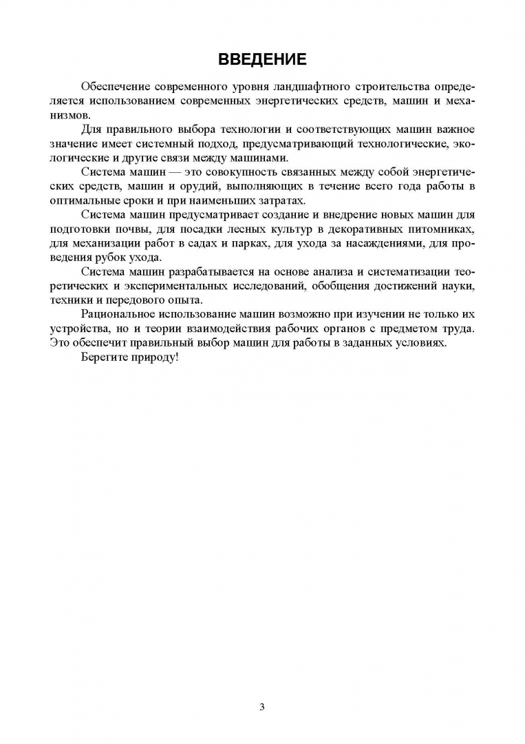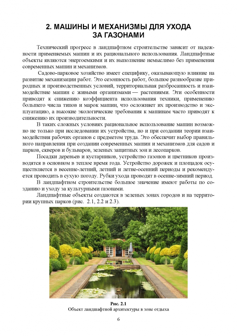 Пособие предназначено для студентов колледжей и техникумов, обучающихся по специальности «Мастер садово-паркового и ландшафтного строительства», «Садово-парковое и ландшафтное строительство», а также фермеров и владельцев загородных участков.СвернутьВ учебном пособии изложены вопросы применения машин и механизмов для комплексной механизации работ в садово-парковом хозяйстве, при уходе за газонами и насаждениями в садах и парках. Материалы по машинам и механизмам, изложенные в учебном пособии, могут быть использованы фермерами в своих хозяйствах для рыхления почвы, для подготовки территории и ухода за приусадебными участками. Рассматриваются основные характеристики машин и механизмов, применяемых в ландшафтном строительстве. Приводятся расчёты сменной производительности машин и механизмов при выполнении соответствующих работ. Излагается методика расчета расхода топлива на технологические процессы, связанные с кошением травяного покрова, подрезанием веток кустарников, созданием посадочных мест для высадки декоративных деревьев в городских условиях и удалением пней фрезерными машинами на территории в садах и парках.