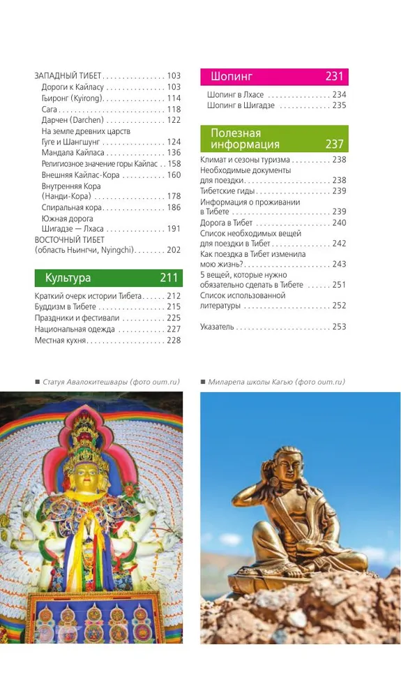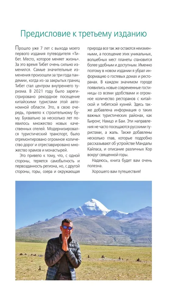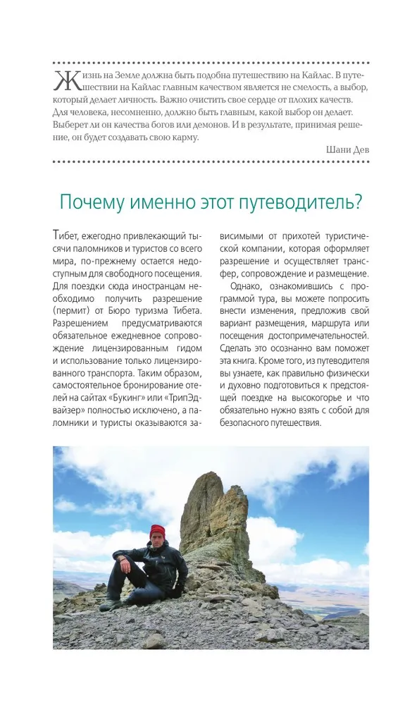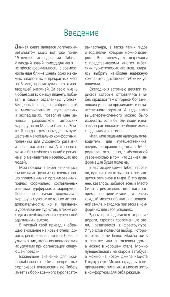 ОписаниеТибет — это уникальная культура с яркими религиозными праздниками и фестивалями, с многовековыми традициями и богатой историей, окутанной тайнами и легендами. Считается, что здесь находится загадочное буддийское царство Шамбала и что именно здесь проходит ось мироздания. В этом регионе расположено более двух тысяч храмовых комплексов и монастырей различных школ. В течение длительного времени в Тибет нельзя было попасть путешественникам, однако сегодня это изменилось и все больше туристов приезжает в этот высокогорный регион с суровым климатом. Отсюда начинаются восхождения на Эверест, самую высокую гору мира, а еще сюда стекаются паломники со всего света, чтобы прочувствовать энергетику горы Кайлас.Алексей Перчуков, автор путеводителя, тщательно изучил и познал одно из самых загадочных мест на Земле, а также на себе ощутил его энергетику. Работая над путеводителем, Алексей постарался сделать ваше путешествие в Тибет не только насыщенным и полезным, но и максимально комфортным.В путеводителе вы найдете подробные описания главных достопримечательностей Тибета, а также подробные маршруты по Внутренним и Внешним Корам вокруг горы Кайлас. Вы также найдете разделы, которые помогут вам физически и духовно подготовиться к путешествию, например, как приспособиться к высокогорью, как облегчить высотную болезнь, когда лучше всего поехать, как физически подготовиться к поездке и т.д. Вы узнаете о правилах посещения монастырей и о процедуре получения разрешения для посещения региона (пермита), а также узнаете много нового об истории Тибета, различных религиозных школах и праздниках.