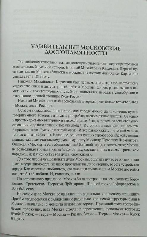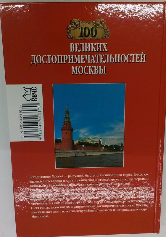 ОписаниеСегодняшняя Москва - растущий, быстро изменяющийся город. Город, где переплелись Европа и Азия, архаическое и сверхсовременное, где перезвон мобильных телефонов сливается с гулом церковных колоколов. Сегодняшняя Москва - это место, где перемешались поколения и образы жизни, стили и направления, где разрушаются мифы, создаются легенды и, конечно же, новые и новые достопримечательности. И хочется верить, что многие из них по праву займут своё место в ряду проверенных веками.О ста самых знаменитых и удивительных достопримечательностях Москвы рассказывает книга известного журналиста, писателя и историка Александра Мясникова.Сегодняшняя Москва - растущий, быстро изменяющийся город. Город, где переплелись Европа и Азия, архаическое и сверхсовременное, где перезвон мобильных телефонов сливается с гулом церковных колоколов. Сегодняшняя Москва - это место, где перемешались поколения и образы жизни, стили и направления, где разрушаются мифы, создаются легенды и, конечно же, новые и новые достопримечательности. И хочется верить, что многие из них по праву займут своё место в ряду проверенных веками.О ста самых знаменитых и удивительных достопримечательностях Москвы рассказывает книга известного журналиста, писателя и историка Александра Мясникова.