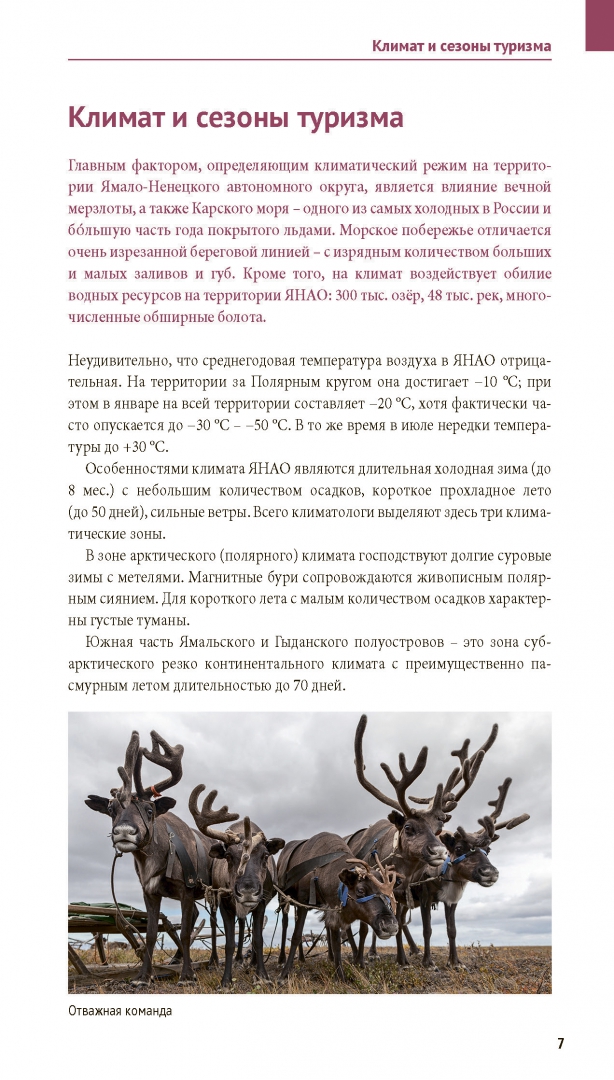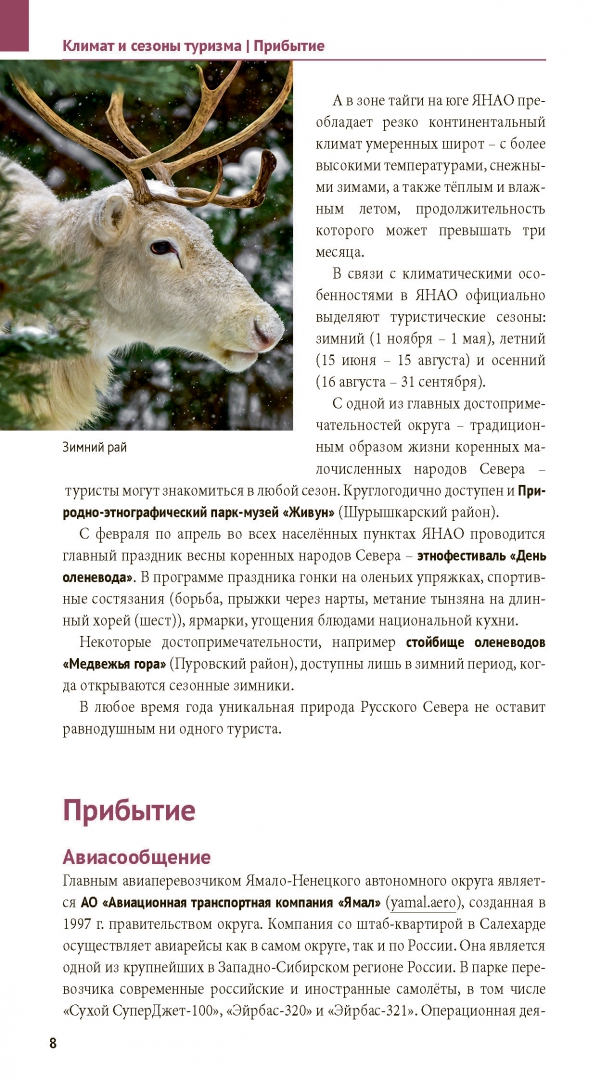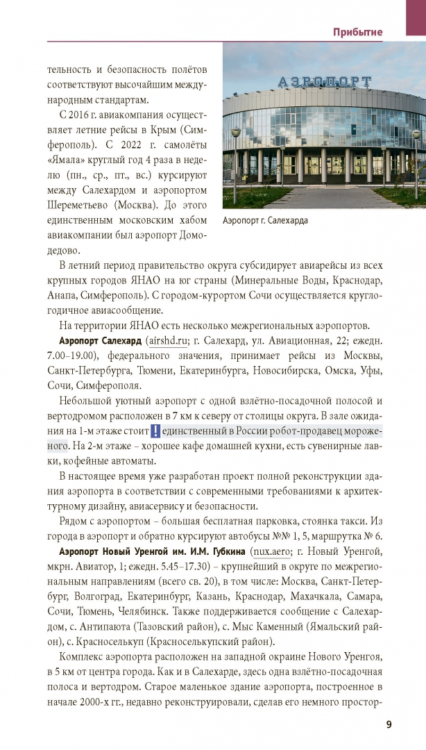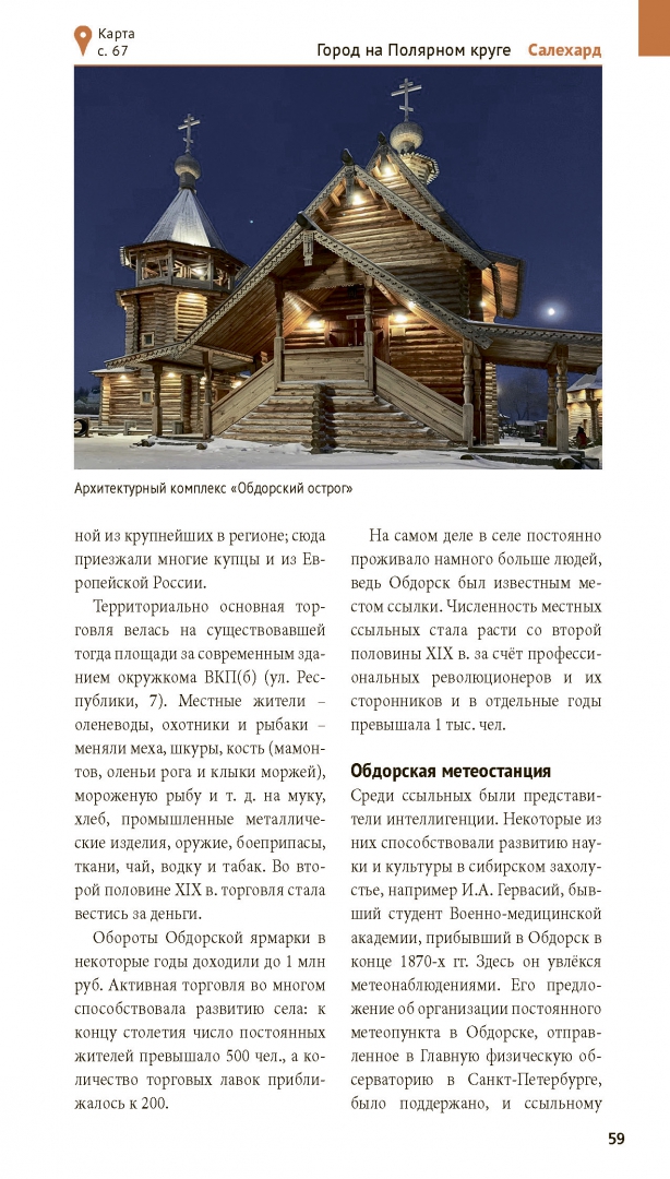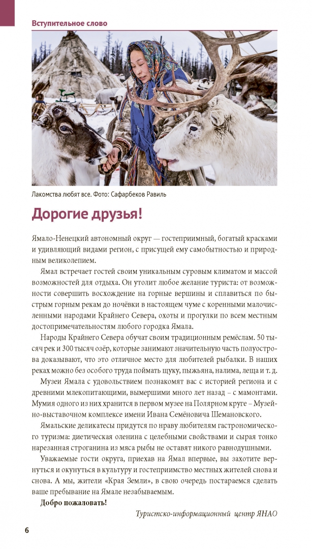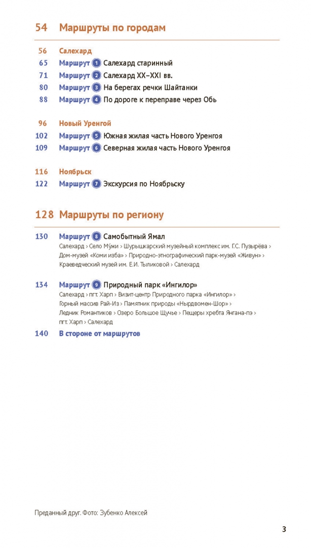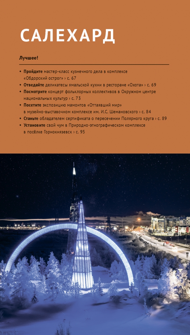 ОписаниеПутеводитель по Ямалу приглашает вас в увлекательное и впечатляющее путешествие по царству вечной мерзлоты, по бескрайней тундре с её причудливой и, вопреки ожиданиям, очень богатой флорой и фауной; по краю, где полярная ночь длится более 40 дней, периодически окрашиваясь буйными красками северного сияния - от кислотно-розовых и салатовых до ярко-желтых, ядовито-синих и пурпурно-красных оттенков. Северное сияние - беспроигрышный вариант для охотников за яркими кадрами! Путеводитель не только проведёт вас по тому или иному из девяти маршрутов (кстати, отмеченных на картах-схемах), но и расскажет, где маршрут лучше начать, как туда добраться, сколько времени займет путешествие, какие основные достопримечательности (музеи, парки, памятники, рестораны и гостиницы) будут встречаться на пути. С путеводителем вы точно не пропустите ни одного интересного местечка, а о самых интересных, загадочных или исторически-важных мы обязательно расскажем подробнее в рубрике "К сведению". Шесть маршрутов из девяти проходят по городам - Салехард, Новый Уренгой, Ноябрьск. Каждый рассчитан примерно на 2-3 часа интересной прогулки. А для тех, кто предпочитает активный отдых (восхождения, байдарки, сплавы, лыжные спуски, рыбалка) или ближе хочет познакомиться с природой, культурой, историей и бытом малых народов севера - предлагается два уникальных Маршрута по регионам. Учтите: чтобы их пройти, потребуется не менее недели на каждый. Но, если вы путешествуете с детьми и не готовы к экстремальной (для современного человека) жизни в юрте, вы можете познакомиться с бытом жителей севера.СвернутьПутеводитель по Ямалу приглашает вас в увлекательное и впечатляющее путешествие по царству вечной мерзлоты, по бескрайней тундре с её причудливой и, вопреки ожиданиям, очень богатой флорой и фауной; по краю, где полярная ночь длится более 40 дней, периодически окрашиваясь буйными красками северного сияния - от кислотно-розовых и салатовых до ярко-желтых, ядовито-синих и пурпурно-красных оттенков. Северное сияние - беспроигрышный вариант для охотников за яркими кадрами! Путеводитель не только проведёт вас по тому или иному из девяти маршрутов (кстати, отмеченных на картах-схемах), но и расскажет, где маршрут лучше начать, как туда добраться, сколько времени займет путешествие, какие основные достопримечательности (музеи, парки, памятники, рестораны и гостиницы) будут встречаться на пути. С путеводителем вы точно не пропустите ни одного интересного местечка, а о самых интересных, загадочных или исторически-важных мы обязательно расскажем подробнее в рубрике "К сведению". Шесть маршрутов из девяти проходят по городам - Салехард, Новый Уренгой, Ноябрьск. Каждый рассчитан примерно на 2-3 часа интересной прогулки. А для тех, кто предпочитает активный отдых (восхождения, байдарки, сплавы, лыжные спуски, рыбалка) или ближе хочет познакомиться с природой, культурой, историей и бытом малых народов севера - предлагается два уникальных Маршрута по регионам. Учтите: чтобы их пройти, потребуется не менее недели на каждый. Но, если вы путешествуете с детьми и не готовы к экстремальной (для современного человека) жизни в юрте, вы можете познакомиться с бытом жителей севера.СвернутьСвернуть