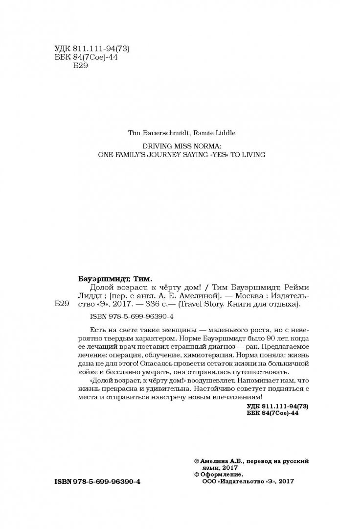 ОписаниеЕсть на свете такие женщины - маленького роста, но с невероятно твердым характером. Норме Бауэршмидт было 90 лет, когда ее лечащий врач поставил страшный диагноз - рак. Предлагаемое лечение: операция, облучение, химиотерапия. Норма поняла: жизнь дана не для этого! Опасаясь провести остаток жизни на больничной койке и бесславно умереть, она отправилась путешествовать."Долой возраст, к чёрту дом!" воодушевляет. Напоминает нам, что жизнь прекрасна и удивительна. Настойчиво советует подняться с места и отправиться навстречу новым впечатлениям!Есть на свете такие женщины - маленького роста, но с невероятно твердым характером. Норме Бауэршмидт было 90 лет, когда ее лечащий врач поставил страшный диагноз - рак. Предлагаемое лечение: операция, облучение, химиотерапия. Норма поняла: жизнь дана не для этого! Опасаясь провести остаток жизни на больничной койке и бесславно умереть, она отправилась путешествовать."Долой возраст, к чёрту дом!" воодушевляет. Напоминает нам, что жизнь прекрасна и удивительна. Настойчиво советует подняться с места и отправиться навстречу новым впечатлениям!