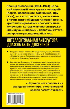 В издание вошли работы «Исследование ужаса», «Разговоры», «О телесном сочетании», «Сны», «О преобразованиях», «Определенное», «Головокружение», дополненные статьей к. филос. н. Анастасии Тороповой.Леонид Липавский (1904–1941) не самый известный член кружка «чинарей» (Хармс, Введенский, Олейников, Друскин), но в его трактатах, написанных в почти античной диалогической форме, кристаллизировались спекулятивные концепции, которые являются выражением духа «чинарей» и попыткой категоризировать распадающийся мир.
