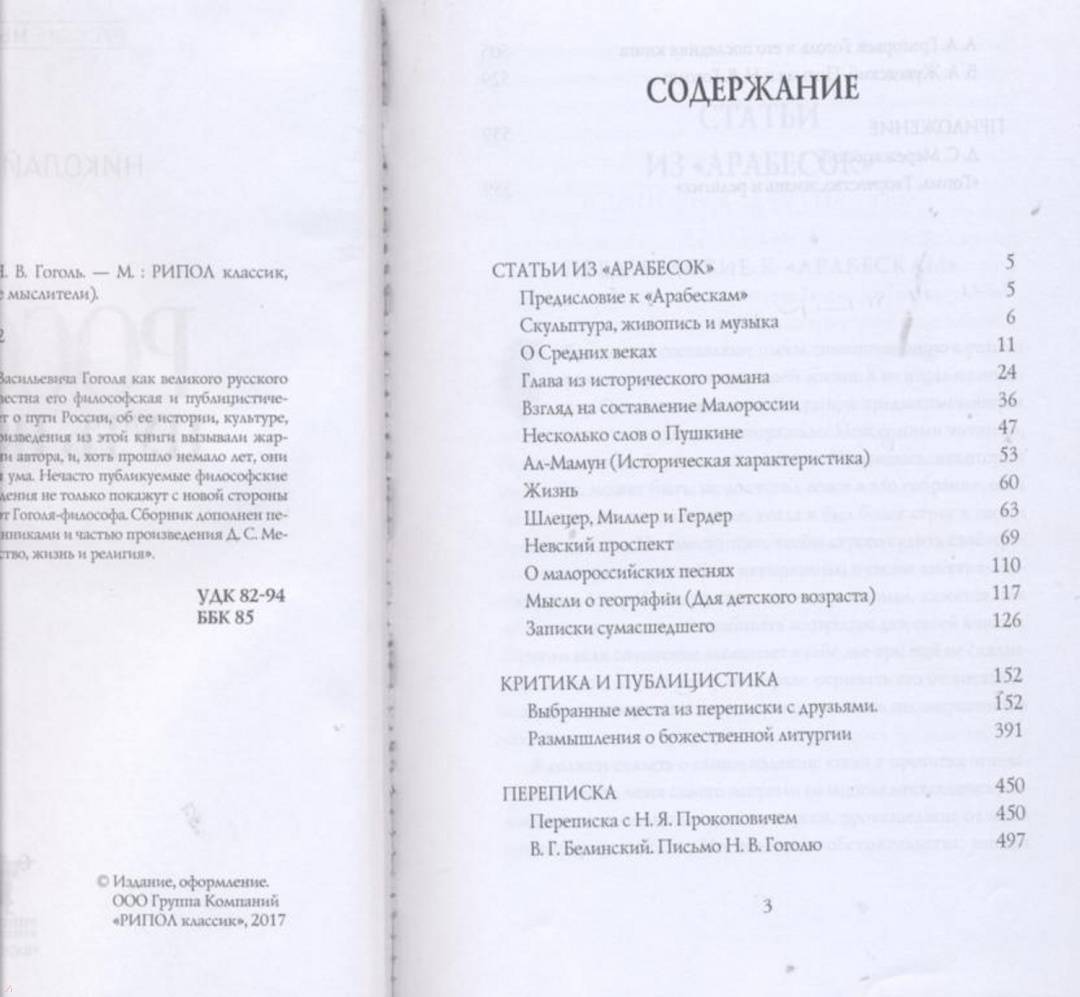 ОписаниеМногие знают Николая Васильевича Гоголя как великого русского писателя. Но не многим известна его философская и публицистическая проза, где он рассуждает о пути России, об ее истории, культуре, народе, вере. Некоторые произведения из этой книги вызывали жаркую полемику еще при жизни автора, и, хоть прошло немало лет, они по-прежнему дают пищу для ума. Нечасто публикуемые философские и публицистические произведения не только покажут с новой стороны Гоголя-писателя, но и откроют Гоголя-философа. Сборник дополнен перепиской писателя с современниками и частью произведения Д.С. Мережковского "Гоголь. Творчество, жизнь и религия".Многие знают Николая Васильевича Гоголя как великого русского писателя. Но не многим известна его философская и публицистическая проза, где он рассуждает о пути России, об ее истории, культуре, народе, вере. Некоторые произведения из этой книги вызывали жаркую полемику еще при жизни автора, и, хоть прошло немало лет, они по-прежнему дают пищу для ума. Нечасто публикуемые философские и публицистические произведения не только покажут с новой стороны Гоголя-писателя, но и откроют Гоголя-философа. Сборник дополнен перепиской писателя с современниками и частью произведения Д.С. Мережковского "Гоголь. Творчество, жизнь и религия".
