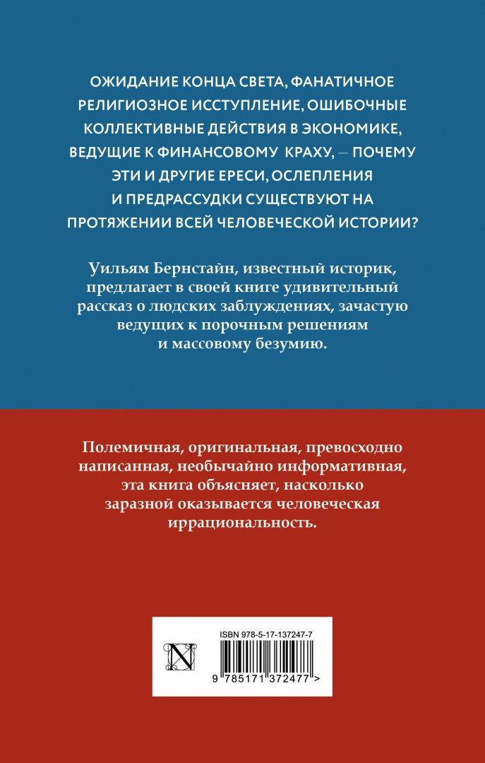 ОписаниеОжидание конца света, фанатичное религиозное исступление, ошибочные коллективные действия в экономике, ведущие к финансовому краху, - почему эти и другие ереси, ослепления и предрассудки существуют на протяжении всей человеческой истории? Уильям Бернстайн, известный историк, предлагает в своей книге удивительный рассказ о людских заблуждениях, зачастую ведущих к порочным решениям и массовому безумию.Полемичная, оригинальная, превосходно написанная, необычайно информативная, эта книга объясняет, насколько заразной оказывается человеческая иррациональность.Ожидание конца света, фанатичное религиозное исступление, ошибочные коллективные действия в экономике, ведущие к финансовому краху, - почему эти и другие ереси, ослепления и предрассудки существуют на протяжении всей человеческой истории? Уильям Бернстайн, известный историк, предлагает в своей книге удивительный рассказ о людских заблуждениях, зачастую ведущих к порочным решениям и массовому безумию.Полемичная, оригинальная, превосходно написанная, необычайно информативная, эта книга объясняет, насколько заразной оказывается человеческая иррациональность.