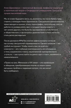 ОписаниеАмия Шринивасан - американский философ, профессор социальной и политической теории в Оксфордском университете. Одна из 50 лучших мыслителей мира.Мы не знаем будущего секса, но, возможно, мы могли бы его представить с помощью Амии Шринивасан. Сексуальные домогательства, права женщин и мужчин, этика, порнография, проституция, секс на работе, университете, секс и государственная власть - нет ничего другого, что было бы одновременно столь личным и общественным, и где вопросы удовольствия и этики могли бы столько резко расходиться.После движения #MeToo многие зафиксировали согласие как основу сексуальной справедливости. Однако согласие - это грубый инструмент. Чтобы понять секс во всей его сложности - его глубокую многогранность, его отношение к полу, социальному классу, национальной принадлежности и власти - нам нужно выйти за рамки "да" и "нет", желаемого и нежелательного."Право на секс" - это провокация и обещание, преображающие многие из наших самых насущных проблем и задающие вопрос, что же значит быть свободным.Книга поднимает важные вопросы политики и этики секса, с которыми повсеместно сталкиваются не только женщины, но и мужчины. Что вынуждает женщин говорить «да»? Каким должен быть секс, чтобы на него согласиться? Почему обладающие таким большим психическим, культурным и юридическим значением рамки «согласия» на самом деле не работают? Как секс соотносится с такими понятиями, как раса, класс, инвалидность, национальность, каста? Автор пересматривает политическую критику секса в XXI веке, дополняя собственные оригинальные идеи множеством историй, примеров и фактов. Книга для тех, кто заинтересован темой феминизма, хочет разобраться в сложных вопросах пола и гендера.