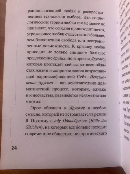 ОписаниеВ динамичном эссе "Агония эроса" Бён-Чхоль Хан рассматривает контроль над страстями в современном обществе как важнейший инструмент "укрощения" и манипулирования со стороны власти. Под гнетом этого контроля человек больше не способен любить и лишь потакает своей сексуальности.Сегодня секс - это перформанс, сексуальность - это капитал. Порно - предвосхищение мертвого секса в виртуальном пространстве, а не живой сексуальности.Общество выгорания, в котором человек истощается сам по себе, без возможности освободиться по отношению к Другому, есть общество без Эроса.В динамичном эссе "Агония эроса" Бён-Чхоль Хан рассматривает контроль над страстями в современном обществе как важнейший инструмент "укрощения" и манипулирования со стороны власти. Под гнетом этого контроля человек больше не способен любить и лишь потакает своей сексуальности.Сегодня секс - это перформанс, сексуальность - это капитал. Порно - предвосхищение мертвого секса в виртуальном пространстве, а не живой сексуальности.Общество выгорания, в котором человек истощается сам по себе, без возможности освободиться по отношению к Другому, есть общество без Эроса.