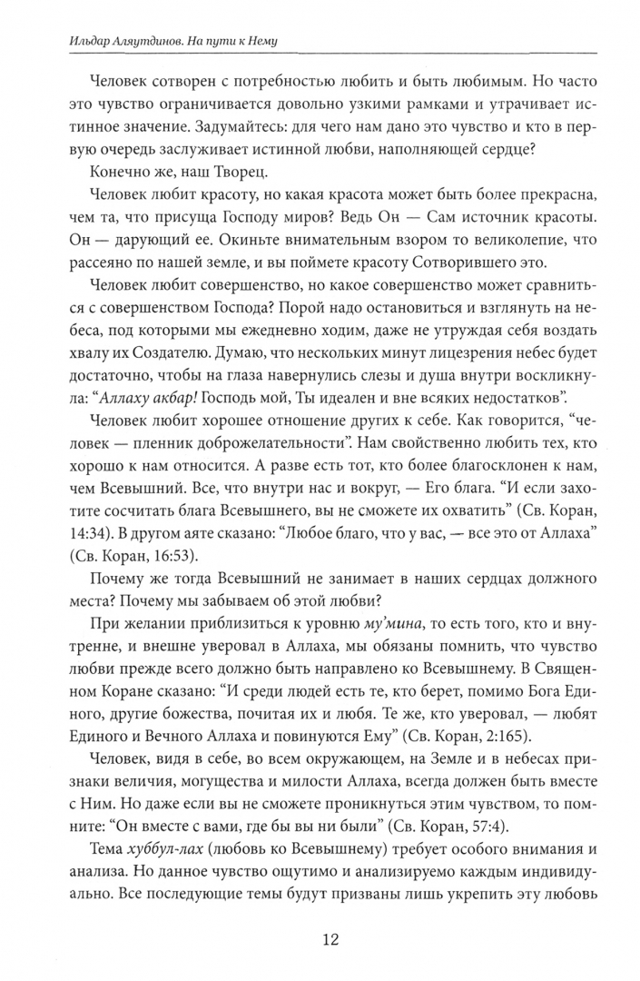 ОписаниеВ основу книги "На пути к Нему" легли темы проповедей, прочитанных автором за последние несколько лет. Этим обусловлен особый стиль повествования: с одной стороны - исторические сюжеты представлены в новом ракурсе, в тесной связи с реалиями жизни, с другой - использована информация из богословских первоисточников. В то же время Ильдар Аляутдинов знакомит читателей с историями, которые были лично им услышаны или записаны с уст известных мусульманских ученых и проповедников.Автор не только приводит факты, но и делится с читателем своими эмоциями, чувствами и переживаниями. Он доверительно беседует о Священном Коране, пророке Мухаммаде, об особо выделенных в мусульманском календаре периодах и Судном Дне.Этот разговор касается не только религиозной практики, ведь человек на протяжении жизни проходит несколько важных этапов, на которых неизбежны ошибки. Как не оказаться сломленным на этом пути, как сохранить в себе веру, не поддаваться страстям и придерживаться правильного пути? Почему в мире происходят катастрофы и беды, почему человек совершает ошибки, и есть ли у грешников шанс на спасение?Ответы на эти вопросы раскрываются на протяжении глав книги. Доступным языком автор рассказывает о незыблемых истинах, способных пробудить искреннее чувство веры, которое подчас дремлет, но требует непременного пробуждения в каждом из нас.Кроме этого, в книге приводятся особенности построения и ведения мусульманского призыва, подробно рассказывается о трех основных видах проповеди - пятничной, праздничной и произносимой во время обряда бракосочетания.Настоящий труд одобрен Централизованной религиозной организацией "Духовное Управление мусульман города Москвы" и будет полезен для широкого круга читателей, стремящихся ближе познакомиться с религией Ислам, а также для тех, кто посвятил или хочет посвятить себя призыву к вере во Всевышнего Аллаха.СвернутьВ основу книги "На пути к Нему" легли темы проповедей, прочитанных автором за последние несколько лет. Этим обусловлен особый стиль повествования: с одной стороны - исторические сюжеты представлены в новом ракурсе, в тесной связи с реалиями жизни, с другой - использована информация из богословских первоисточников. В то же время Ильдар Аляутдинов знакомит читателей с историями, которые были лично им услышаны или записаны с уст известных мусульманских ученых и проповедников.Автор не только приводит факты, но и делится с читателем своими эмоциями, чувствами и переживаниями. Он доверительно беседует о Священном Коране, пророке Мухаммаде, об особо выделенных в мусульманском календаре периодах и Судном Дне.Этот разговор касается не только религиозной практики, ведь человек на протяжении жизни проходит несколько важных этапов, на которых неизбежны ошибки. Как не оказаться сломленным на этом пути, как сохранить в себе веру, не поддаваться страстям и придерживаться правильного пути? Почему в мире происходят катастрофы и беды, почему человек совершает ошибки, и есть ли у грешников шанс на спасение?Ответы на эти вопросы раскрываются на протяжении глав книги. Доступным языком автор рассказывает о незыблемых истинах, способных пробудить искреннее чувство веры, которое подчас дремлет, но требует непременного пробуждения в каждом из нас.Кроме этого, в книге приводятся особенности