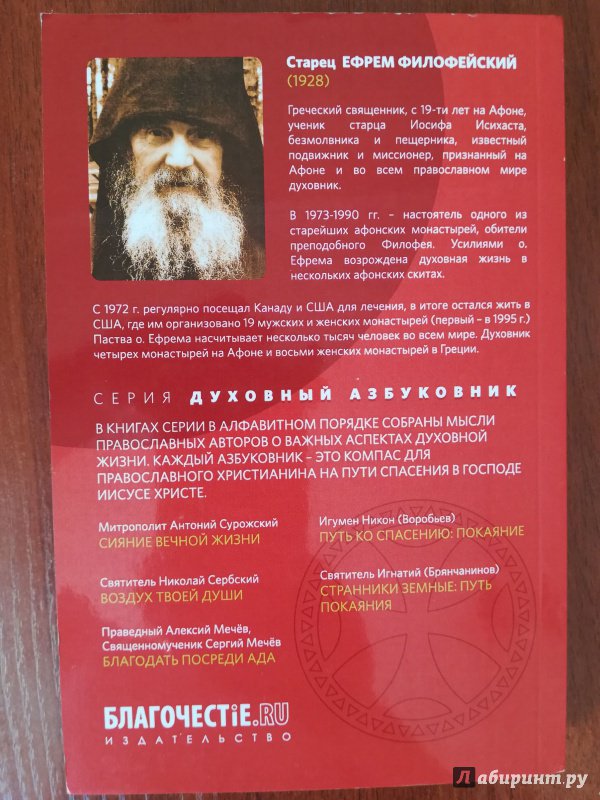Объем, стр. 350 ISBN 978-5-9909282-3-7 Автор Старец Ефрем Филофейский Серия Духовный азбуковник Год издания книги 2017 Тип обложки Мягкий переплет Иллюстрации Черно-белые Вес, г 260г Размеры 180х200х15 мм - Отзывы