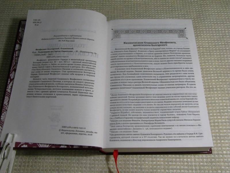 ОписаниеФеофилакт, архиепископ Охриды в византийской провинции Болгарии (вторая пол. XI - нач. XII в.) - крупный византийский богослов. Родом с о. Эвбеи, он долгое время служил диаконом при храме Святой Софии в Константинополе и ритором. Его обязанностью было объяснять Священное Писание и составлять поучительные слова от имени патриарха. Став архиепископом Болгарской Церкви, блаженный Феофилакт показал себя мудрым и твердым пастырем.Большую часть творений блаженного Феофилакта составляют толкования Священного Писания, в которых он следует традиции отцов антиохийской школы, особенно святителя Иоанна Златоуста. Труд блаженного Феофилакта Болгарского, посвященный истолкованию Четвероевангелия, доступен пониманию всякого и прост, и вместе с тем с древних времен почитается Русской Церковью творением истинно отеческим и православным, верно передающим смысл Евангельских изречений.Рекомендовано к публикации Издательским Советом Русской Православной ЦерквиИС Р18-824-3445Феофилакт, архиепископ Охриды в византийской провинции Болгарии (вторая пол. XI - нач. XII в.) - крупный византийский богослов. Родом с о. Эвбеи, он долгое время служил диаконом при храме Святой Софии в Константинополе и ритором. Его обязанностью было объяснять Священное Писание и составлять поучительные слова от имени патриарха. Став архиепископом Болгарской Церкви, блаженный Феофилакт показал себя мудрым и твердым пастырем.Большую часть творений блаженного Феофилакта составляют толкования Священного Писания, в которых он следует традиции отцов антиохийской школы, особенно святителя Иоанна Златоуста. Труд блаженного Феофилакта Болгарского, посвященный истолкованию Четвероевангелия, доступен пониманию всякого и прост, и вместе с тем с древних времен почитается Русской Церковью творением истинно отеческим и православным, верно передающим смысл Евангельских изречений.Рекомендовано к публикации Издательским Советом Русской Православной ЦерквиИС Р18-824-3445