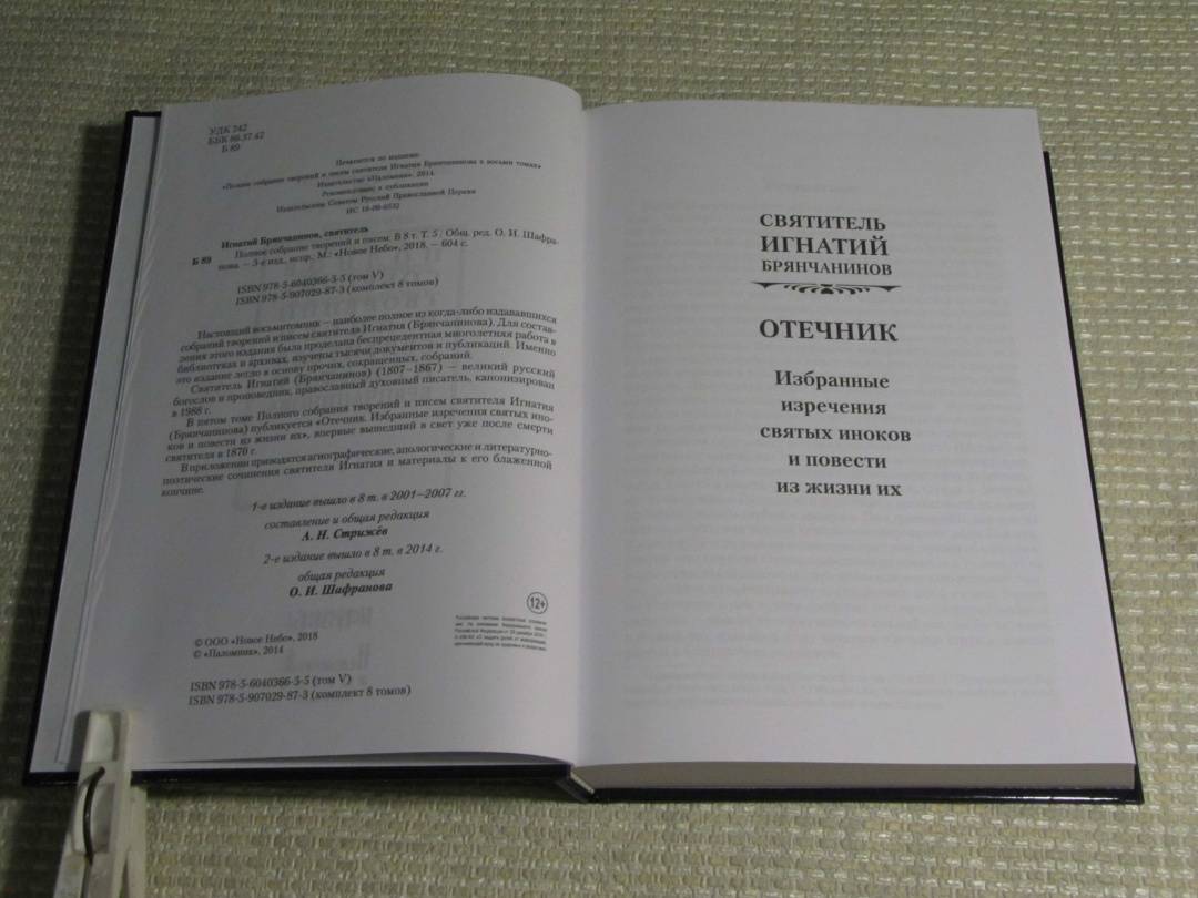 ОписаниеВ пятом томе Полного собрания творений и писем святителя Игнатия (Брянчанинова) публикуется "Отечник. Избранные изречения святых иноков и повести из жизни их", впервые вышедший в свет уже после смерти святителя в 1870 г. В приложении приводятся агиографические, апологические и литературно-поэтические сочинения святителя Игнатия и материалы к его блаженной кончине.3-е издание, исправленное.В пятом томе Полного собрания творений и писем святителя Игнатия (Брянчанинова) публикуется "Отечник. Избранные изречения святых иноков и повести из жизни их", впервые вышедший в свет уже после смерти святителя в 1870 г. В приложении приводятся агиографические, апологические и литературно-поэтические сочинения святителя Игнатия и материалы к его блаженной кончине.3-е издание, исправленное.