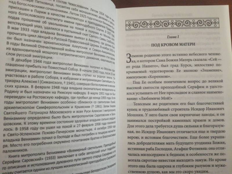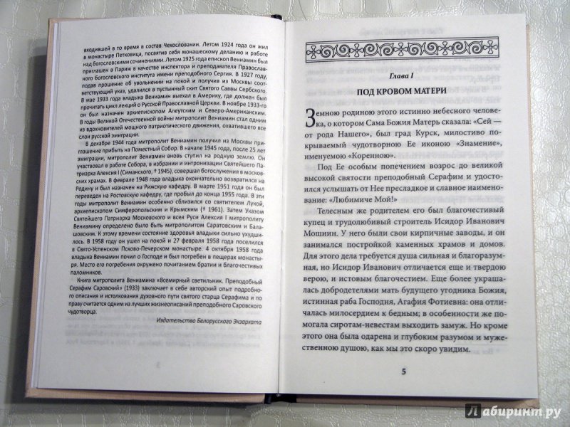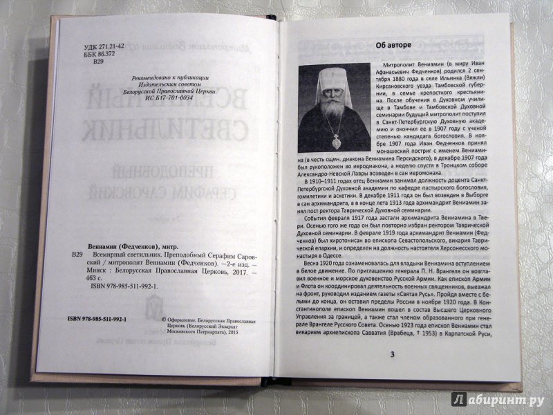 ОписаниеКнига "Всемирный светильник" написана митрополитом Вениамином (Федченковым) в 1933 году и посвящена 100-летию со дня кончины преподобного Серафима Саровского. Будучи опытным духовным писателем, владыка с особой любовью обращался к житийной литературе, рассказам о святых угодниках Божиих, их подвигах и чудотворениях. Так, в 1930-1931 годах в Париже и в Вене митрополит Вениамин начал работу над рукописью под названием "Из того мира", повествующей о непостижимых для человеческого разума событиях, о чудесах и знамениях Божиих. Значительное место в этой работе было посвящено святому старцу Серафиму Саровскому. В книгу "Всемирный светильник" вошли главы из указанной выше рукописи, а также осмысленные и переработанные автором жизнеописания преподобного, составленные иноками Сергием, Георгием и Иоасафом, Н.В. Елагиным, Л.И. Денисовым. Кроме того, приводятся воспоминания Н.А. Мотовилова, Н. Аксаковой, записи священномученика Серафима (Чичагова) и С.А. Нилуса. Творение митрополита Вениамина заключает в себе авторский опыт подробного описания и истолкования духовного пути святого старца Серафима и по праву считается одним из лучших жизнеописаний преподобного Саровского чудотворца.Рекомендовано к публикации Издательским советом Белорусской Православной Церкви.3-е издание.СвернутьКнига "Всемирный светильник" написана митрополитом Вениамином (Федченковым) в 1933 году и посвящена 100-летию со дня кончины преподобного Серафима Саровского. Будучи опытным духовным писателем, владыка с особой любовью обращался к житийной литературе, рассказам о святых угодниках Божиих, их подвигах и чудотворениях. Так, в 1930-1931 годах в Париже и в Вене митрополит Вениамин начал работу над рукописью под названием "Из того мира", повествующей о непостижимых для человеческого разума событиях, о чудесах и знамениях Божиих. Значительное место в этой работе было посвящено святому старцу Серафиму Саровскому. В книгу "Всемирный светильник" вошли главы из указанной выше рукописи, а также осмысленные и переработанные автором жизнеописания преподобного, составленные иноками Сергием, Георгием и Иоасафом, Н.В. Елагиным, Л.И. Денисовым. Кроме того, приводятся воспоминания Н.А. Мотовилова, Н. Аксаковой, записи священномученика Серафима (Чичагова) и С.А. Нилуса. Творение митрополита Вениамина заключает в себе авторский опыт подробного описания и истолкования духовного пути святого старца Серафима и по праву считается одним из лучших жизнеописаний преподобного Саровского чудотворца.Рекомендовано к публикации Издательским советом Белорусской Православной Церкви.3-е издание.СвернутьСвернуть