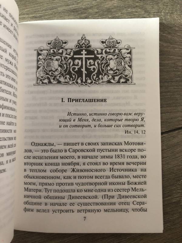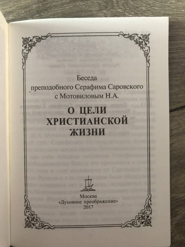 ОписаниеБеседа преподобного Серафима с Николаем Александровичем Мотовиловым (1809-1879) о цели христианской жизни произошла в ноябре 1831 года в лесу, неподалеку от Саровской обители, и была записана Мотовиловым. Рукопись была обнаружена через 70 лет в бумагах жены Николая Александровича, Елены Ивановны Мотовиловой. Кажущая простота беседы обманчива: поучения произносит один из величайших святых Русской Церкви, а слушателем является будущий подвижник веры, исцеленный по молитве Серафима от неизлечимой болезни. Именно Н.А. Мотовилову преподобный Серафим завещал перед смертью материальные заботы о своих "дивеевских сиротах", об основании им Серафимо-Дивеевской обители.Беседа преподобного Серафима с Николаем Александровичем Мотовиловым (1809-1879) о цели христианской жизни произошла в ноябре 1831 года в лесу, неподалеку от Саровской обители, и была записана Мотовиловым. Рукопись была обнаружена через 70 лет в бумагах жены Николая Александровича, Елены Ивановны Мотовиловой. Кажущая простота беседы обманчива: поучения произносит один из величайших святых Русской Церкви, а слушателем является будущий подвижник веры, исцеленный по молитве Серафима от неизлечимой болезни. Именно Н.А. Мотовилову преподобный Серафим завещал перед смертью материальные заботы о своих "дивеевских сиротах", об основании им Серафимо-Дивеевской обители.