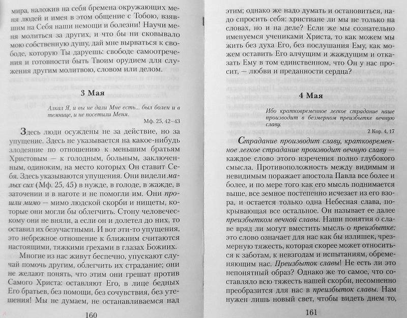 ОписаниеКнига "День за днем", написанная неизвестным православным священником и изданная впервые в 1908 году, составлена в виде календаря, который соответствует старому стилю, и предназначена для ежедневного чтения. Автор на примерах из Священного Писания находит ответ на многие сложные вопросы, возникающие у каждого христианина на трудном и полном скорбей жизненном пути. Вопросы эти и сегодня остаются актуальными. Удивительно проникновенные слова утешения и ободрения, несомненно, принесут большую пользу каждому благочестивому христианину и любому человеку, решившемуся встать на путь истинной веры. Уже в наше время эта книга выдержала множество изданий, став любимым чтением современного православного читателя. Из письма Государыни Александры Феодоровны Анне Александровне Вырубовой, написанного в заключении в Тобольске: "Каждое утро читаю книгу, которую ты мне подарила семь лет тому назад: "День за днем", и очень ее люблю, нахожу много слов утешения". Рекомендовано к публикации Издательским Советом РПЦСвернутьКнига "День за днем", написанная неизвестным православным священником и изданная впервые в 1908 году, составлена в виде календаря, который соответствует старому стилю, и предназначена для ежедневного чтения. Автор на примерах из Священного Писания находит ответ на многие сложные вопросы, возникающие у каждого христианина на трудном и полном скорбей жизненном пути. Вопросы эти и сегодня остаются актуальными. Удивительно проникновенные слова утешения и ободрения, несомненно, принесут большую пользу каждому благочестивому христианину и любому человеку, решившемуся встать на путь истинной веры. Уже в наше время эта книга выдержала множество изданий, став любимым чтением современного православного читателя. Из письма Государыни Александры Феодоровны Анне Александровне Вырубовой, написанного в заключении в Тобольске: "Каждое утро читаю книгу, которую ты мне подарила семь лет тому назад: "День за днем", и очень ее люблю, нахожу много слов утешения". Рекомендовано к публикации Издательским Советом РПЦСвернутьСвернуть