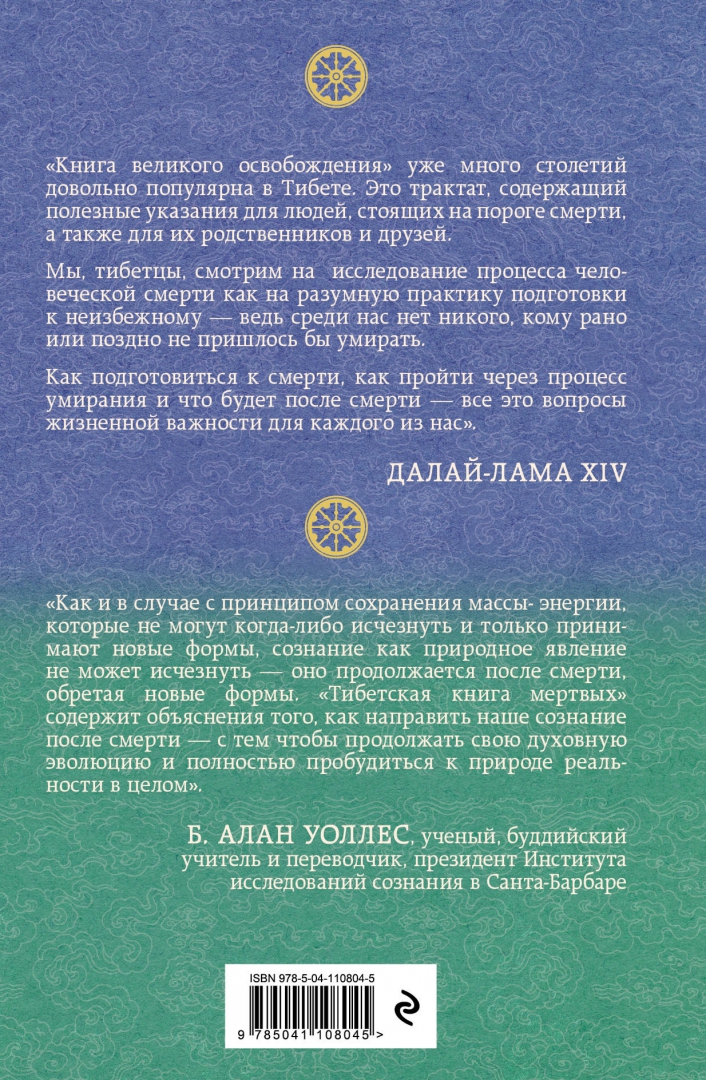 ОписаниеЛегендарный текст тибетского буддизма, известный на Западе как "Тибетская книга мертвых". Его цель, прежде всего, практическая: обеспечить людей, стоящих на пороге смерти, своего рода "дорожной картой" для предстоящего им путешествия, а также дать полезные указания их близким."Книга" была составлена великим учителем тибетского буддизма Гуру Падмасамбхавой (VIII-IX век) и записана его супругой, йогиней Еше Цогьял. Данная версия книги была переведена с тибетского известным современным буддологом и ученым Робертом Турманом. Он также снабдил книгу комментариями, которые делают древний текст доступным и полезным для всех желающих. "Книгу" предваряет предисловие Далай-ламы, а также предисловие русского монаха и учителя тибетского буддизма Лобсанга Тенпы, написанное специально для этого русскоязычного издания.Оно также включает обновленную редакцию русского текста, выполненную в соответствии в современной буддийской лексикой.Далай-лама: «Текст ?Бардо тходрол?, известный на Западе как ?Тибетская книга мертвых?, — один из самых важных текстов, созданных нашей цивилизацией. Мы,