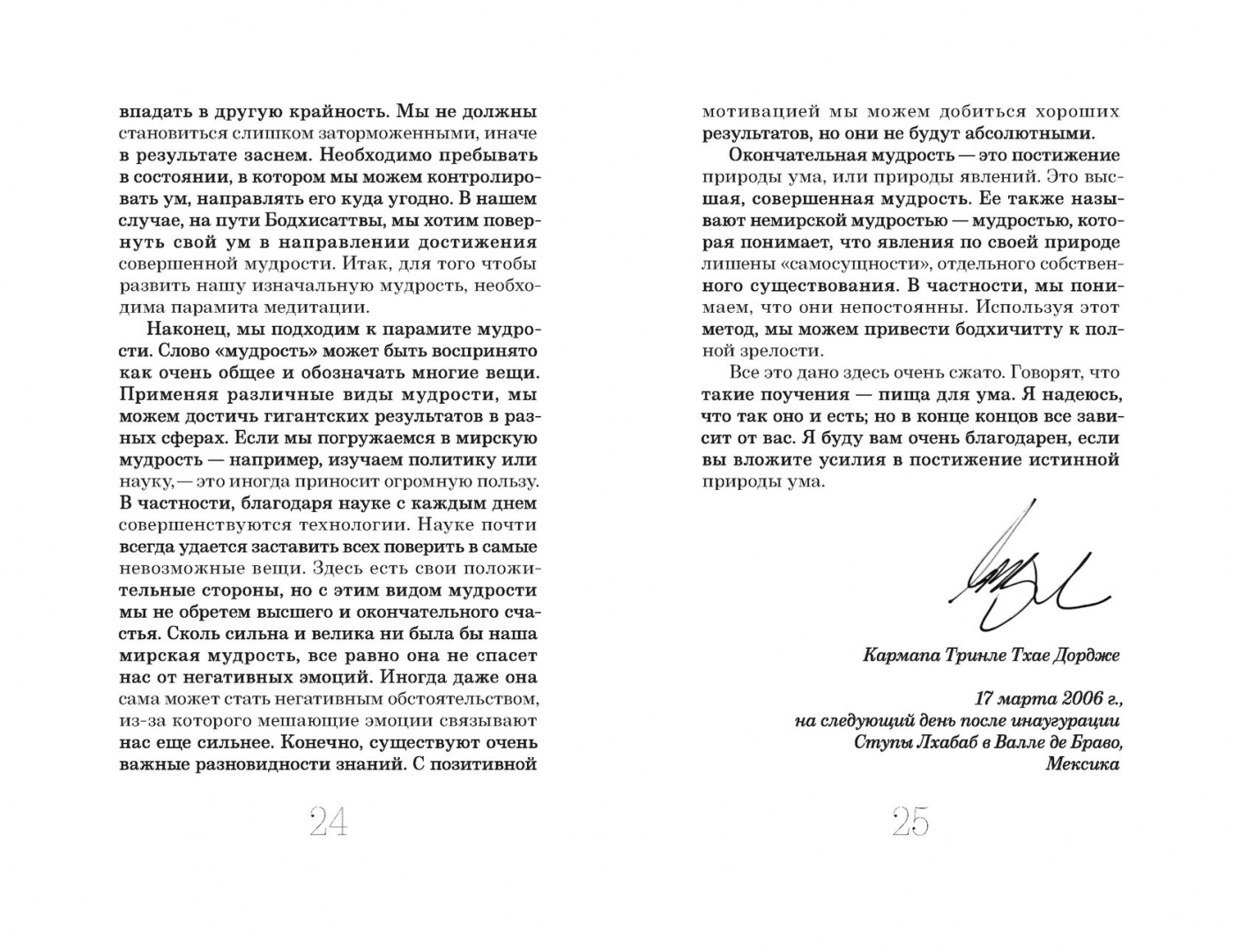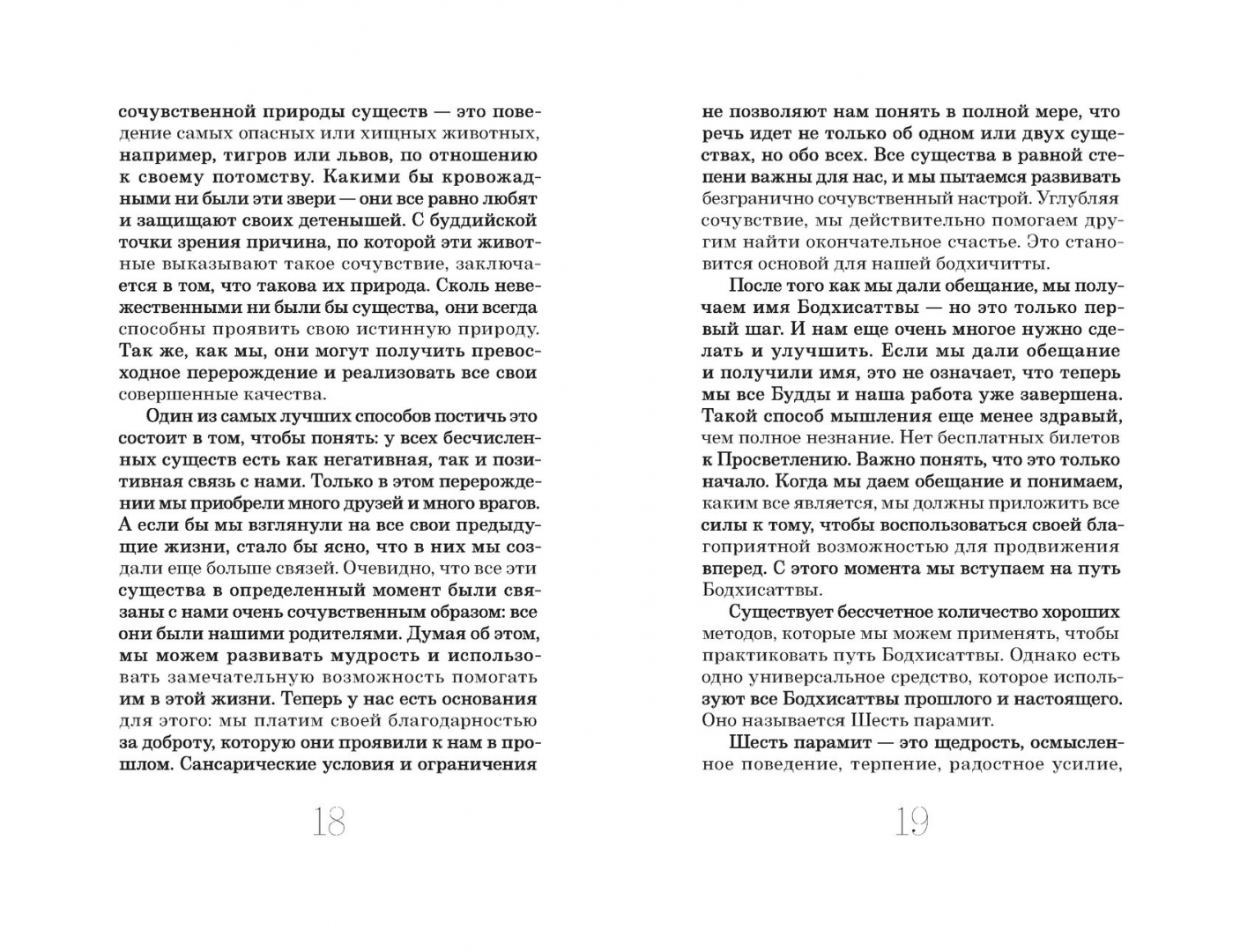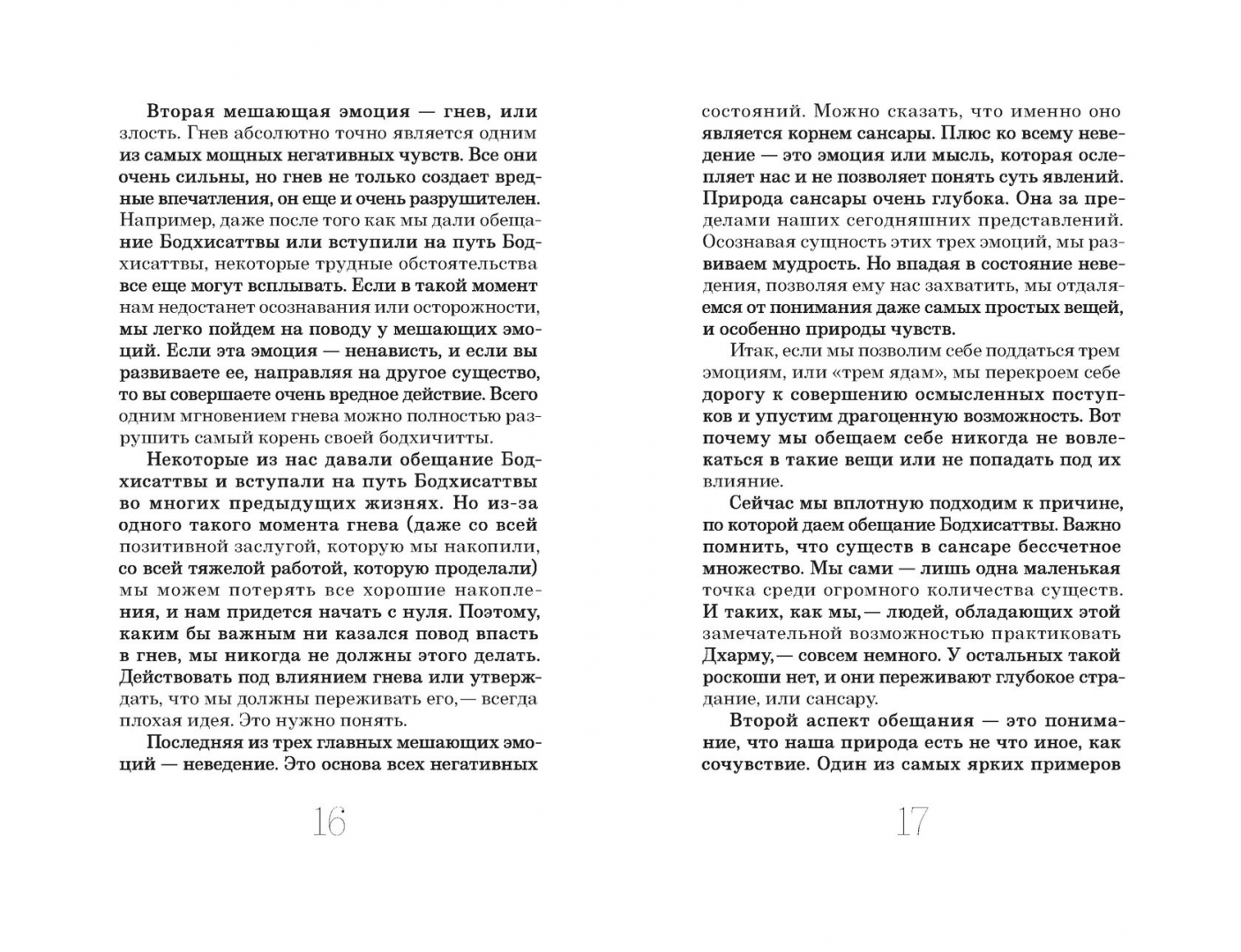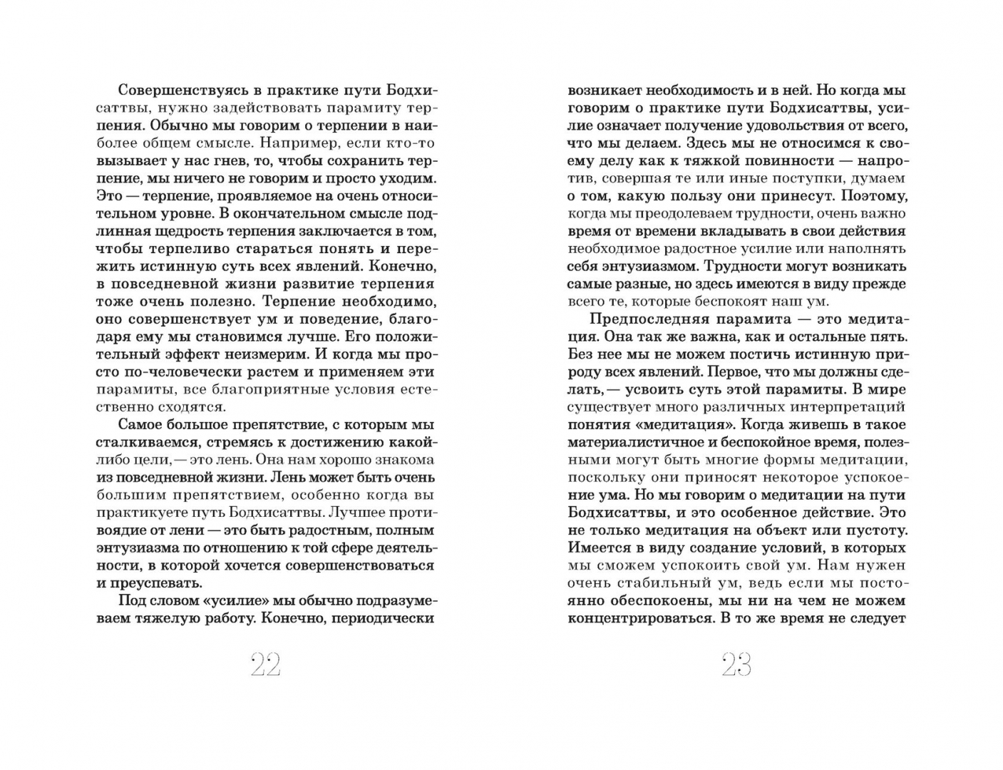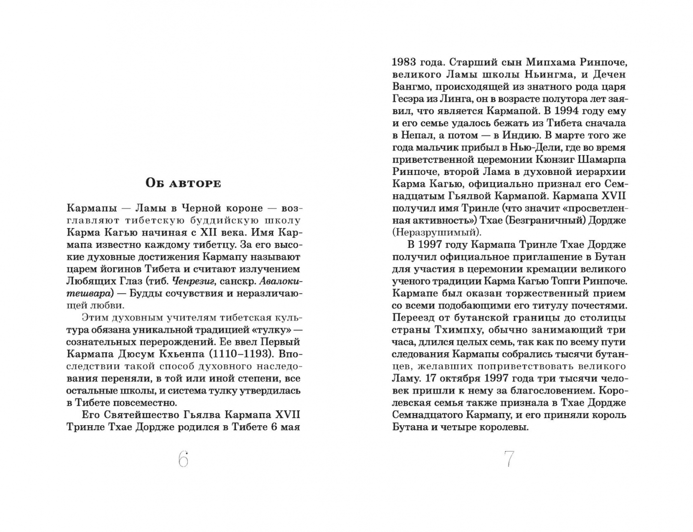 ОписаниеВ книге "Практика Бодхисаттвы" собраны лекции современного буддийского ламы, главы традиции Карма Кагью тибетского буддизма Его Святейшества Семнадцатого Гьялвы Кармапы Тринле Тхае Дордже. Лекции посвящены важнейшей теме буддизма Махаяны и Ваджраяны - пути Бодхисаттвы. В первой части автор раскрывает темы мешающих эмоций, Шести парамит, рассказывает о содержании обета Бодхисаттвы. Вторая часть - это комментарий Гьялвы Кармапы к классическому тексту "37 практик Бодхисаттвы" тибетского автора XIII-XIV вв. Гьялсе Тхогме Зангпо.Кармапы - Ламы в Черной короне - возглавляют тибетскую буддийскую школу Карма Кагью начиная с XII века. Имя "Кармапа" известно каждому тибетцу. За его высокое духовное достижение Кармапу называют царем йогинов Тибета и считают излучением Любящих Глаз (тиб. Ченрезиг, санскр. Авалокитешвара) - Будды сочувствия и неразличающей любви.Об авторе:Его Святейшество Гьялва Кармапа XVII Тринле Тхае Дордже родился в Тибете 6 мая 1983 года. В 1994 году ему и его семье удалось бежать сначала в Непал, а потом - в Индию. В марте того же года мальчик прибыл в Нью-Дели, где Кюнзиг Шамарпа Ринпоче, второй Лама в духовной иерархии Карма Кагью, официально признал его Семнадцатым Гьялвой Кармапой.В июне 2009 года, по приглашению главы Республики Калмыкия Кирсана Илюмжинова, Кармапа Тринле Тхае Дордже побывал в России. Он встретился с официальными лицами и общественностью в шести городах России, посетил главу российских буддистов Хамбо Ламу Дамбу Аюшеева и выразил свое почтение нетленному телу Хамбо Ламы Итигэлова в Иволгинском дацане (Бурятия). Его визит широко освещался в российской прессе.СвернутьВ книге "Практика Бодхисаттвы" собраны лекции современного буддийского ламы, главы традиции Карма Кагью тибетского буддизма Его Святейшества Семнадцатого Гьялвы Кармапы Тринле Тхае Дордже. Лекции посвящены важнейшей теме буддизма Махаяны и Ваджраяны - пути Бодхисаттвы. В первой части автор раскрывает темы мешающих эмоций, Шести парамит, рассказывает о содержании обета Бодхисаттвы. Вторая часть - это комментарий Гьялвы Кармапы к классическому тексту "37 практик Бодхисаттвы" тибетского автора XIII-XIV вв. Гьялсе Тхогме Зангпо.Кармапы - Ламы в Черной короне - возглавляют тибетскую буддийскую школу Карма Кагью начиная с XII века. Имя "Кармапа" известно каждому тибетцу. За его высокое духовное достижение Кармапу называют царем йогинов Тибета и считают излучением Любящих Глаз (тиб. Ченрезиг, санскр. Авалокитешвара) - Будды сочувствия и неразличающей любви.Об авторе:Его Святейшество Гьялва Кармапа XVII Тринле Тхае Дордже родился в Тибете 6 мая 1983 года. В 1994 году ему и его семье удалось бежать сначала в Непал, а потом - в Индию. В марте того же года мальчик прибыл в Нью-Дели, где Кюнзиг Шамарпа Ринпоче, второй Лама в духовной иерархии Карма Кагью, официально признал его Семнадцатым Гьялвой Кармапой.В июне 2009 года, по приглашению главы Республики Калмыкия Кирсана Илюмжинова, Кармапа Тринле Тхае Дордже побывал в России. Он встретился с официальными лицами и общественностью в шести городах России, посетил главу российских буддистов Хамбо Ламу Дамбу Аюшеева и выразил свое почтение нетленному телу Хамбо Ламы Итигэлова в Иволгинском дацане (Бурятия). Его визит широко освещался в российской прессе.СвернутьСвернуть