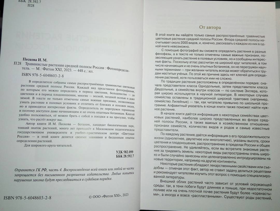 ОписаниеВ определителе собраны самые распространённые травянистые цветковые растения средней полосы России. Каждый вид представлен фотографиями, по которым его можно определить в период цветения, большинство - до цветения и в период плодоношения, многие - весной, поздней осенью и даже зимой. В тексте не только отмечены самые важные признаки, позволяющие узнать растение в полевых условиях и отличить от близких и похожих видов, но и приводятся интересные факты. Определитель не перегружен терминами и поэтому доступен даже начинающим и не очень опытным ботаникам. Книгой удобно пользоваться, её можно брать с собой в поездки и на прогулки, чтобы узнать, что растёт вокруг вас.Автор книги И. М. Пескова - ботаник, кандидат биологических наук, тонкий знаток растений, много лет преподаёт в Московском педагогическом государственном университете и учебно-практическом центре "Цветущая планета" - в этой книге делится своими знаниями и бесценным опытом определения растений.Для широкого круга читателей.2-е издание, переработанное и дополненное.СвернутьВ определителе собраны самые распространённые травянистые цветковые растения средней полосы России. Каждый вид представлен фотографиями, по которым его можно определить в период цветения, большинство - до цветения и в период плодоношения, многие - весной, поздней осенью и даже зимой. В тексте не только отмечены самые важные признаки, позволяющие узнать растение в полевых условиях и отличить от близких и похожих видов, но и приводятся интересные факты. Определитель не перегружен терминами и поэтому доступен даже начинающим и не очень опытным ботаникам. Книгой удобно пользоваться, её можно брать с собой в поездки и на прогулки, чтобы узнать, что растёт вокруг вас.Автор книги И. М. Пескова - ботаник, кандидат биологических наук, тонкий знаток растений, много лет преподаёт в Московском педагогическом государственном университете и учебно-практическом центре "Цветущая планета" - в этой книге делится своими знаниями и бесценным опытом определения растений.Для широкого круга читателей.2-е издание, переработанное и дополненное.СвернутьСвернуть
