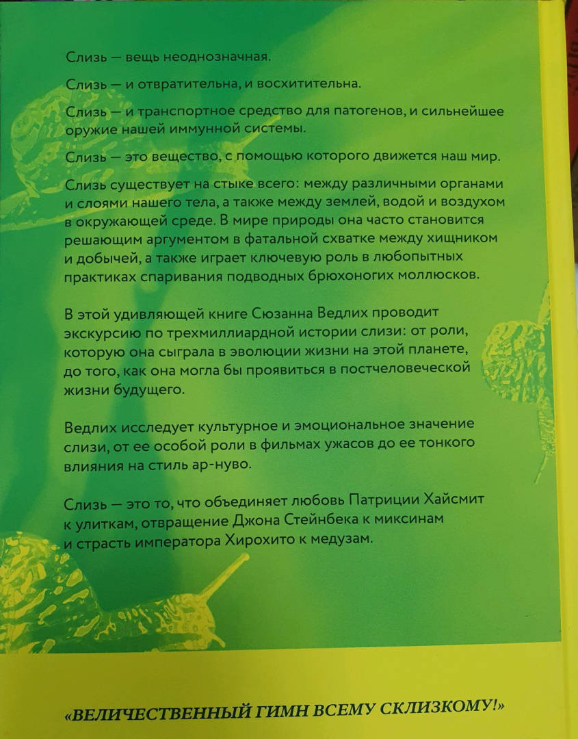 СвернутьСлизь - вещь неоднозначная.Слизь - и отвратительна, и восхитительна.Слизь - и транспортное средство для патогенов, и сильнейшее оружие нашей иммунной системы.Слизь - это вещество, с помощью которого движется наш мир.Слизь существует на стыке всего: между различными органами и слоями нашего тела, а также между землей, водой и воздухом в окружающей среде. В мире природы она часто становится решающим аргументом в фатальной схватке между хищником и добычей, а также играет ключевую роль в любопытных практиках спаривания подводных брюхоногих моллюсков.В этой удивляющей книге Сюзанна Ведлих проводит экскурсию по трехмиллиардной истории слизи: от роли, которую она сыграла в эволюции жизни на этой планете, до того, как она могла бы проявиться в постчеловеческой жизни будущего. Ведлих исследует культурное и эмоциональное значение слизи, от ее особой роли в фильмах ужасов до ее тонкого влияния на стиль ар-нуво.Слизь - это то, что объединяет любовь Патриции Хайсмит к улиткам, отвращение Джона Стейнбека к миксинам и страсть императора Хирохито к медузам.«Книга слизи. Скользкий след в истории Земли» – книга, которая перевернет ваше представление о мире! Вы узнаете, какую роль слизь на самом деле играет в организме – как человеческом, так и любого другого живого существа, – и какие свойства делают ее уникальной биологической субстанцией, предопределившей траекторию мировой эволюции. Книга охватывает самые разные области: начиная физикой и заканчивая культурой.