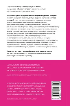 ОписаниеСовременный мир непредсказуем и полон парадоксов, и бывает непросто ориентироваться в его сложностях и противоречиях. "Радость науки" содержит восемь коротких уроков, которые помогут раскрыть ясность, силу и радость научного взгляда на мир. В этом кратком руководстве по рациональному образу жизни известный физик Джим Аль-Халили предлагает читателям взаимодействовать с миром так, как учили ученых. Научный метод хорошо послужил человечеству в его стремлении видеть вещи такими, какие они есть на самом деле, и в основе научного метода лежат основные принципы, которые могут помочь всем нам увереннее ориентироваться в современной жизни. Обсуждая природу истины и неопределенности, роль сомнения, плюсы и минусы упрощения, важность критического мышления и многое другое, Аль-Халили показывает, как мощные идеи, лежащие в основе научного взгляда на мир, помогут каждому человеку, пусть и далекому от лабораторий, сделать свою жизнь чуточку проще. Прочтите эту книгу и откройте для себя радость науки. Это даст вам возможность развеять туман заблуждений и взглянуть на мир по-научному.СвернутьСовременный мир непредсказуем и полон парадоксов, и бывает непросто ориентироваться в его сложностях и противоречиях. "Радость науки" содержит восемь коротких уроков, которые помогут раскрыть ясность, силу и радость научного взгляда на мир. В этом кратком руководстве по рациональному образу жизни известный физик Джим Аль-Халили предлагает читателям взаимодействовать с миром так, как учили ученых. Научный метод хорошо послужил человечеству в его стремлении видеть вещи такими, какие они есть на самом деле, и в основе научного метода лежат основные принципы, которые могут помочь всем нам увереннее ориентироваться в современной жизни. Обсуждая природу истины и неопределенности, роль сомнения, плюсы и минусы упрощения, важность критического мышления и многое другое, Аль-Халили показывает, как мощные идеи, лежащие в основе научного взгляда на мир, помогут каждому человеку, пусть и далекому от лабораторий, сделать свою жизнь чуточку проще. Прочтите эту книгу и откройте для себя радость науки. Это даст вам возможность развеять туман заблуждений и взглянуть на мир по-научному.СвернутьСвернуть