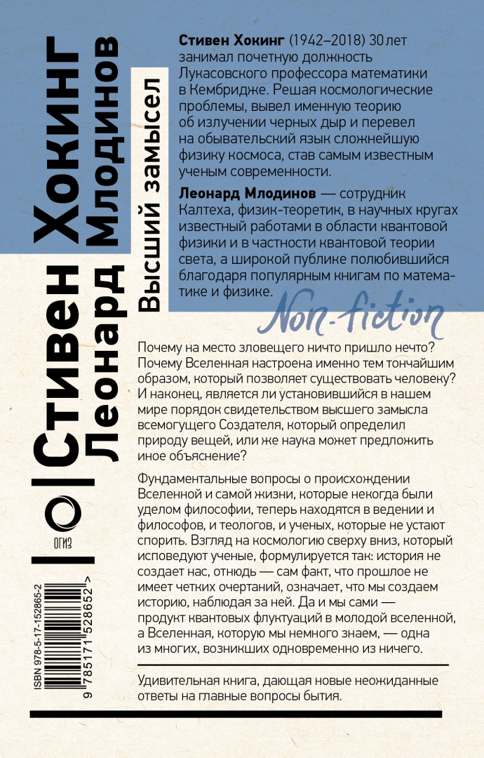Объем, стр. 256 ISBN 978-5-17-152865-2 Автор Хокинг Стивен, Млодинов Леонард, Шимановская Елена, Дамбис Андрей Карлович Переводчик Шимановская Елена, Дамбис Андрей Карлович Серия Эксклюзив: non-fiction Масса 170 г Размеры 180x117x15 мм Язык Русский Минимальный возраст 12+ Год издания книги 2022 Тип обложки Мягкий переплет Иллюстрации Черно-белые Вес, г 172 Размеры 180х115х14 мм - Отзывы