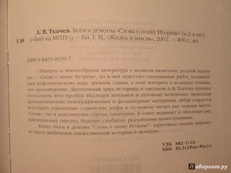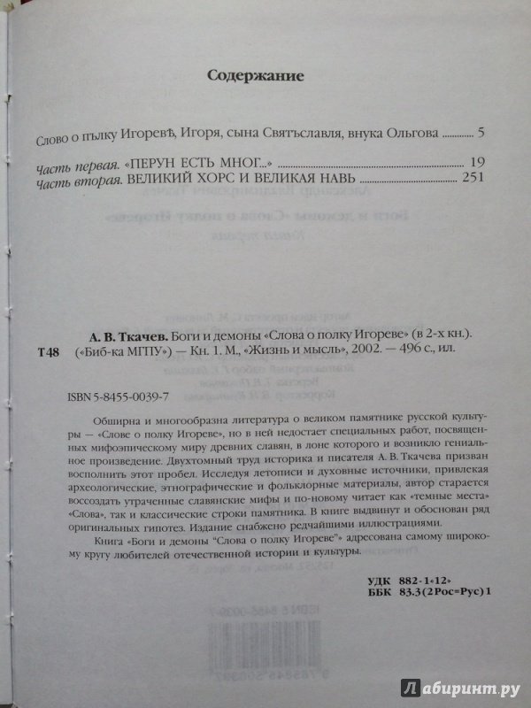 ОписаниеОбширна и многообразна литература о великом памятнике русской культуры - "Слове о полку Игореве", но в ней недостает специальных работ, посвященных мифоэпическому миру древних славян, в лоне которого и возникло гениальное произведение. Двухтомный труд историка и писателя А.В. Ткачева призван восполнить этот пробел. Исследуя летописи и духовные источники, привлекая археологические, этнографические и фольклорные материалы, автор старается воссоздать утраченные славянские мифы и по-новому читает как "темные места" "Слова", так и классические строки памятника. В книге выдвинут и обоснован ряд оригинальных гипотез. Издание снабжено редчайшими иллюстрациями. Книга "Боги и демоны "Слова о полку Игореве" адресована самому широкому кругу любителей отечественной истории и культуры.Обширна и многообразна литература о великом памятнике русской культуры - "Слове о полку Игореве", но в ней недостает специальных работ, посвященных мифоэпическому миру древних славян, в лоне которого и возникло гениальное произведение. Двухтомный труд историка и писателя А.В. Ткачева призван восполнить этот пробел. Исследуя летописи и духовные источники, привлекая археологические, этнографические и фольклорные материалы, автор старается воссоздать утраченные славянские мифы и по-новому читает как "темные места" "Слова", так и классические строки памятника. В книге выдвинут и обоснован ряд оригинальных гипотез. Издание снабжено редчайшими иллюстрациями. Книга "Боги и демоны "Слова о полку Игореве" адресована самому широкому кругу любителей отечественной истории и культуры.