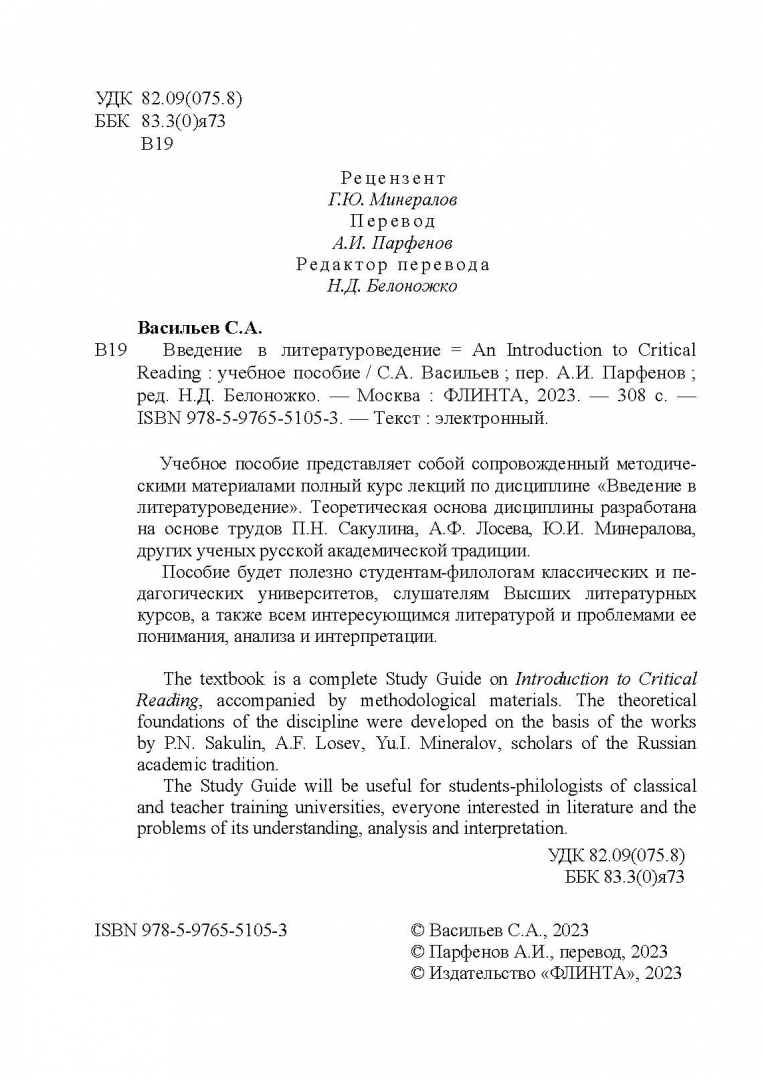 ОписаниеУчебное пособие представляет собой сопровожденный методическими материалами полный курс лекций по дисциплине "Введение в литературоведение". Теоретическая основа дисциплины разработана на основе трудов П.Н. Сакулина, А.Ф. Лосева, Ю.И. Минералова, других ученых русской академической традиции.Пособие будет полезно студентам-филологам классических и педагогических университетов, слушателям Высших литературных курсов, а также всем интересующимся литературой и проблемами ее понимания, анализа и интерпретации.Учебное пособие представляет собой сопровожденный методическими материалами полный курс лекций по дисциплине "Введение в литературоведение". Теоретическая основа дисциплины разработана на основе трудов П.Н. Сакулина, А.Ф. Лосева, Ю.И. Минералова, других ученых русской академической традиции.Пособие будет полезно студентам-филологам классических и педагогических университетов, слушателям Высших литературных курсов, а также всем интересующимся литературой и проблемами ее понимания, анализа и интерпретации.