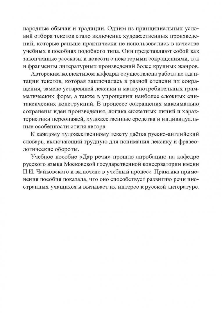 ОписаниеВ учебном пособии "Дар речи" по аналитическому чтению для студентов-иностранцев представлены в адаптированном и сокращённом виде произведения русских писателей XIX-XX веков. Материалы пособия - литературные тексты, структурированные по различным тематическим разделам; задания, включающие работу над лексикой и фразеологией с переводом на английский язык; вопросы к текстам; дополнительный литературный и информационный материал - рассчитаны на расширение возможностей понимания учащимися авторского замысла, особенностей языка художественных произведений, развитие речи.Книга предназначена для иностранцев, изучающих русский язык на уровне В1-В2, студентов-русистов, учащихся школ русскоязычной диаспоры зарубежных стран, преподавателей русской литературы и русского языка как иностранного.В учебном пособии "Дар речи" по аналитическому чтению для студентов-иностранцев представлены в адаптированном и сокращённом виде произведения русских писателей XIX-XX веков. Материалы пособия - литературные тексты, структурированные по различным тематическим разделам; задания, включающие работу над лексикой и фразеологией с переводом на английский язык; вопросы к текстам; дополнительный литературный и информационный материал - рассчитаны на расширение возможностей понимания учащимися авторского замысла, особенностей языка художественных произведений, развитие речи.Книга предназначена для иностранцев, изучающих русский язык на уровне В1-В2, студентов-русистов, учащихся школ русскоязычной диаспоры зарубежных стран, преподавателей русской литературы и русского языка как иностранного.