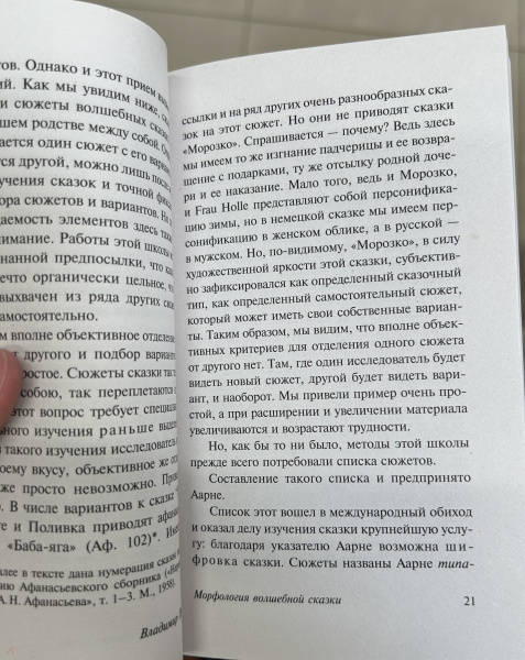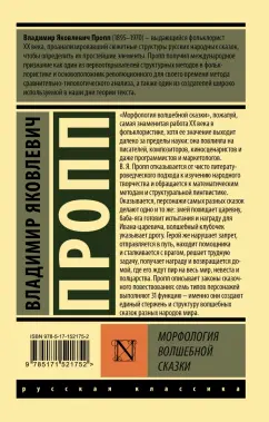 Оказывается, персонажи самых разных сказок делают одно и то же: змей похищает царевну, баба-яга готовит испытания и награду для Ивана-царевича, волшебный клубочек указывает дрогу. Герой же нарушает запрет, отправляется в путь, находит помощника и сталкивается с врагом, решает трудную задачу, получает награду и возвращается домой, где его ждут пир на весь мир, невеста и полцарства. Пропп описывает законы сказочного повествования: семь типов персонажей выполняют 31 функцию – именно они создают единый стержень и структуру волшебных сказок разных народов мира.Почти сто лет назад Владимир Пропп сумел доказать, что у каждой сказки, русской, европейской, африканской или индийской, есть свой предсказуемый алгоритм. Единственное, что меняется раз от раза — это стиль повествования, атрибуты героев и их мотивация. В остальном любое произведение можно разложить на универсальные составляющие. Настольная книга для сценаристов, писателей, любителей фольклора и авторов художественной литературы.