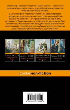 ОписаниеАлександр Павлович Чудаков (1938—2005) — известный литературовед и писатель, крупнейший исследователь творчества Антона Чехова. В монографии «Поэтика Чехова» он рассматривает все творчество писателя как целостную систему, описывая свойства разных ее уровней — от предметного до идейного, на основе собранного им статистического материала. Под чуткий взор исследователя попадают взаимоотношения персонажей и повествователя, выбор сюжетов и средства детализации художественного пространства.Александр Павлович Чудаков (1938—2005) — известный литературовед и писатель, крупнейший исследователь творчества Антона Чехова. В монографии «Поэтика Чехова» он рассматривает все творчество писателя как целостную систему, описывая свойства разных ее уровней — от предметного до идейного, на основе собранного им статистического материала. Под чуткий взор исследователя попадают взаимоотношения персонажей и повествователя, выбор сюжетов и средства детализации художественного пространства.