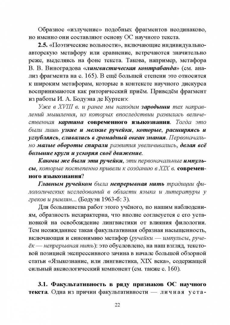 ОписаниеВ монографии рассматриваются актуальные для современного терминоведения вопросы, связанные с образностью научного текста и способами её реализации. В качестве теоретической базы исследования введено понятие "образный слой текста", который образуют извлеченные из лингвистических и филологических текстов двадцати авторов фрагменты различного текстового объёма и включающие в качестве организующего компонента живой образ того или иного типа: метафору, сравнение, уподобление и фразеологизм. Проанализированы интерпретирующая, предикативная, терминологическая и эмоционально-оценочная функции когнитивного образа научного текста. Также уделено внимание разного типа внутриязыковым и межъязыковым перекличкам. Книга адресована терминоведам, специалистам в области лексикологии, лексикографии и стилистики, а также аспирантам и магистрантам, осваивающим учебный курс "Проблемы терминологии в профессиональной сфере", и способствует формированию метафорической компетенции у современной профессиональной личности.СвернутьВ монографии рассматриваются актуальные для современного терминоведения вопросы, связанные с образностью научного текста и способами её реализации. В качестве теоретической базы исследования введено понятие "образный слой текста", который образуют извлеченные из лингвистических и филологических текстов двадцати авторов фрагменты различного текстового объёма и включающие в качестве организующего компонента живой образ того или иного типа: метафору, сравнение, уподобление и фразеологизм. Проанализированы интерпретирующая, предикативная, терминологическая и эмоционально-оценочная функции когнитивного образа научного текста. Также уделено внимание разного типа внутриязыковым и межъязыковым перекличкам. Книга адресована терминоведам, специалистам в области лексикологии, лексикографии и стилистики, а также аспирантам и магистрантам, осваивающим учебный курс "Проблемы терминологии в профессиональной сфере", и способствует формированию метафорической компетенции у современной профессиональной личности.СвернутьСвернуть