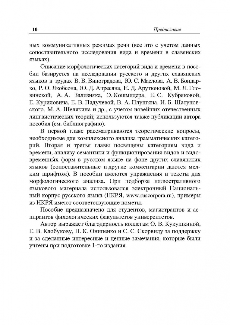 ОписаниеВ основу данного учебного пособия положены материалы общих и специальных курсов лекций по русской морфологии и грамматическим категориям глагола, читаемых автором на филологическом факультете МГУ имени М. В. Ломоносова. Это второе издание книги, впервые опубликованной в 2009 г., переработанное и дополненное. В учебном пособии грамматические категории вида и времени рассматриваются с учетом современных отечественных лингвистических теорий и данных сопоставительной славянской аспектологии. Основное внимание уделено семантике и функциям вида и видо-временных форм русского глагола в разных коммуникативных типах речи. Анализируются также дискуссионные вопросы изучения категорий вида и времени. Во втором издании обновлена информация о современных лингвистических исследованиях в области грамматики, добавлены новые разделы. Имеются упражнения и тексты для семантического и морфологического анализа глагольных форм.Пособие предназначено для студентов, магистрантов и аспирантов филологических факультетов университетов.2-е издание, исправленное и дополненное.СвернутьВ основу данного учебного пособия положены материалы общих и специальных курсов лекций по русской морфологии и грамматическим категориям глагола, читаемых автором на филологическом факультете МГУ имени М. В. Ломоносова. Это второе издание книги, впервые опубликованной в 2009 г., переработанное и дополненное. В учебном пособии грамматические категории вида и времени рассматриваются с учетом современных отечественных лингвистических теорий и данных сопоставительной славянской аспектологии. Основное внимание уделено семантике и функциям вида и видо-временных форм русского глагола в разных коммуникативных типах речи. Анализируются также дискуссионные вопросы изучения категорий вида и времени. Во втором издании обновлена информация о современных лингвистических исследованиях в области грамматики, добавлены новые разделы. Имеются упражнения и тексты для семантического и морфологического анализа глагольных форм.Пособие предназначено для студентов, магистрантов и аспирантов филологических факультетов университетов.2-е издание, исправленное и дополненное.СвернутьСвернуть