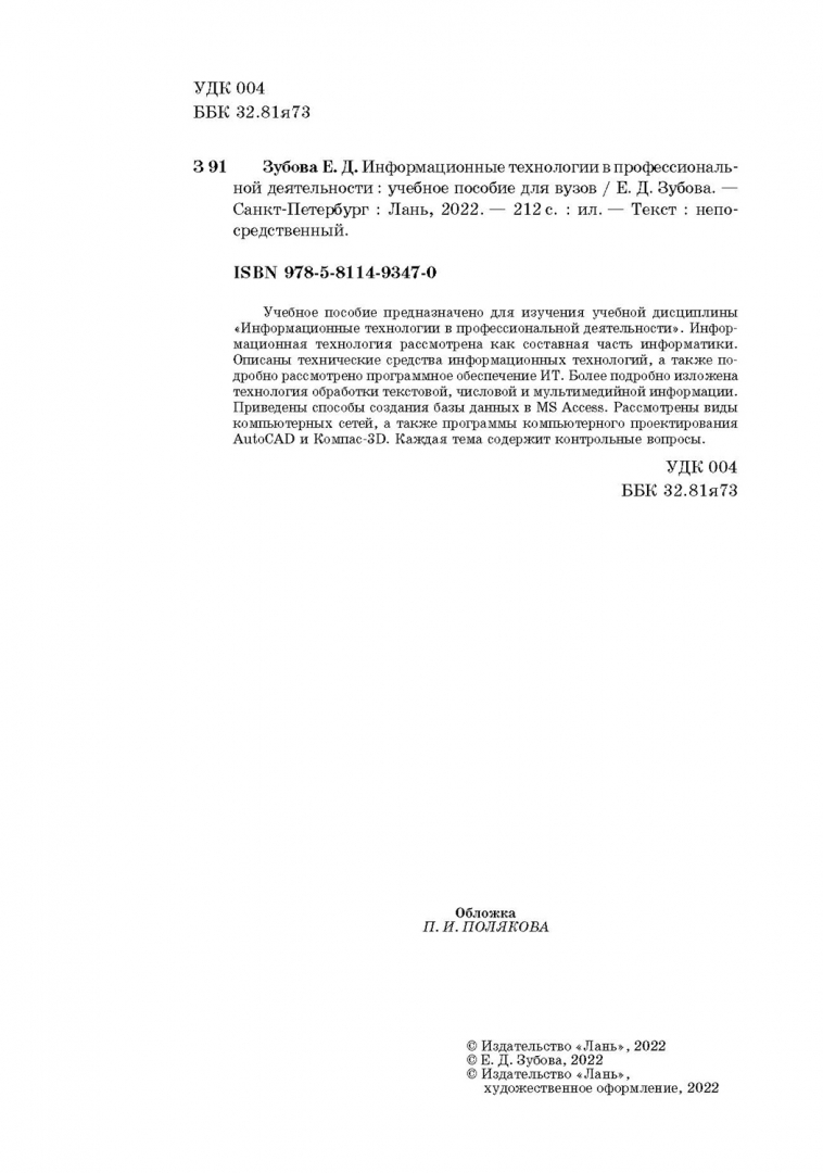 Объем, стр. 212 ISBN 978-5-8114-9347-0 Автор Зубова Елена Дмитриевна Серия Компьютеры и программное обеспечение Язык Русский Год издания книги 2022 Тип обложки Твердый переплет Иллюстрации Черно-белые Вес, г 408г Размеры 240х172х11 мм - Отзывы