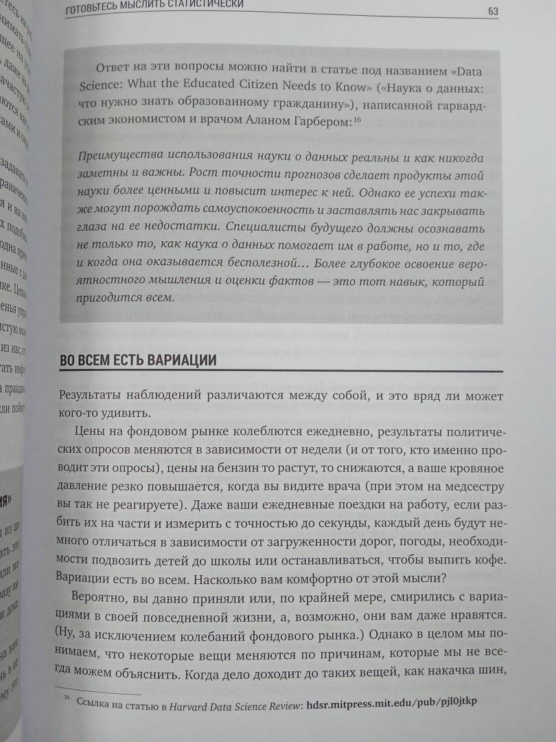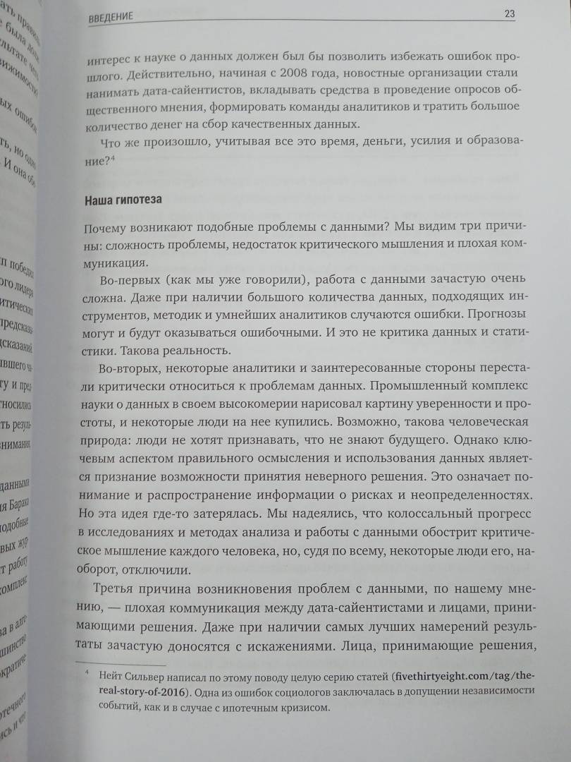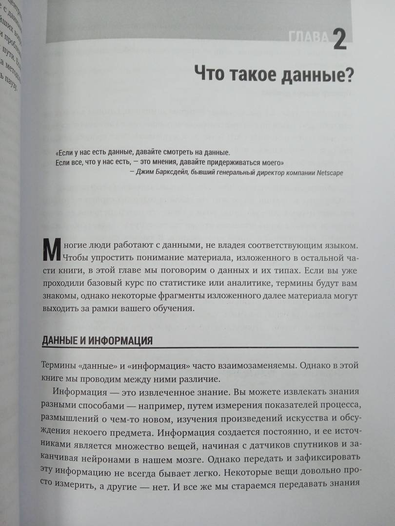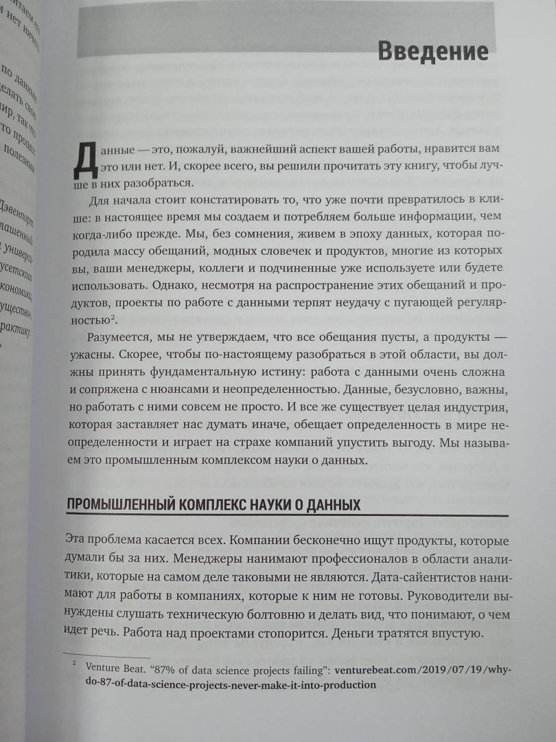 ОписаниеИсчерпывающее руководство по основам Data Science. Что мешает раскрытию истинного потенциала науки о данных? Очевидно, проблема не в медленных алгоритмах, не в недостатке данных и уж точно не в нехватке вычислительной мощности или дата-сайентистов. Дело в распространенном заблуждении, что Data Science - это сложно и заниматься наукой о данных могут только опытные программисты. На самом деле, это не так.Эта книга развеет все мифы и научит вас:- Мыслить статистически и понимать, какую роль в вашей работе и играет аналитика.- Пользоваться языком науки о данных, то есть осмысленно говорить и задавать правильные вопросы относительно статистики. - Понимать реальное положение вещей в таких областях, как машинное обучение, текстовая аналитика, глубокое обучение и искусственный интеллект. - Избегать распространенных ошибок при работе с данными и их интерпретацией. Руководство будет полезным каждому желающему научиться ориентироваться в грядущем будущем, неразрывно связанным с Data Science.СвернутьИсчерпывающее руководство по основам Data Science. Что мешает раскрытию истинного потенциала науки о данных? Очевидно, проблема не в медленных алгоритмах, не в недостатке данных и уж точно не в нехватке вычислительной мощности или дата-сайентистов. Дело в распространенном заблуждении, что Data Science - это сложно и заниматься наукой о данных могут только опытные программисты. На самом деле, это не так.Эта книга развеет все мифы и научит вас:- Мыслить статистически и понимать, какую роль в вашей работе и играет аналитика.- Пользоваться языком науки о данных, то есть осмысленно говорить и задавать правильные вопросы относительно статистики. - Понимать реальное положение вещей в таких областях, как машинное обучение, текстовая аналитика, глубокое обучение и искусственный интеллект. - Избегать распространенных ошибок при работе с данными и их интерпретацией. Руководство будет полезным каждому желающему научиться ориентироваться в грядущем будущем, неразрывно связанным с Data Science.СвернутьСвернуть