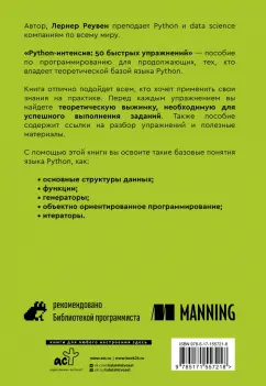 ОписаниеАвтор, Реувен Лернер преподает Python и data science компаниям по всему миру."Python-интенсив: 50 быстрых упражнений" - пособие по программированию для продолжающих, тех, кто владеет теоретической базой языка Python. Книга отлично подойдет всем, кто хочет применить свои знания на практике. Перед каждым упражнением вы найдете теоретическую выжимку, необходимую для успешного выполнения заданий. Пособие также содержит ссылки на разбор упражнений и полезные материалы. С помощью этой книги вы освоите такие базовые понятия языка Python, как: - основные структуры данных,- функции,- генераторы, - объектно-ориентированное программирование- итераторы.Автор, Реувен Лернер преподает Python и data science компаниям по всему миру."Python-интенсив: 50 быстрых упражнений" - пособие по программированию для продолжающих, тех, кто владеет теоретической базой языка Python. Книга отлично подойдет всем, кто хочет применить свои знания на практике. Перед каждым упражнением вы найдете теоретическую выжимку, необходимую для успешного выполнения заданий. Пособие также содержит ссылки на разбор упражнений и полезные материалы. С помощью этой книги вы освоите такие базовые понятия языка Python, как: - основные структуры данных,- функции,- генераторы, - объектно-ориентированное программирование- итераторы.