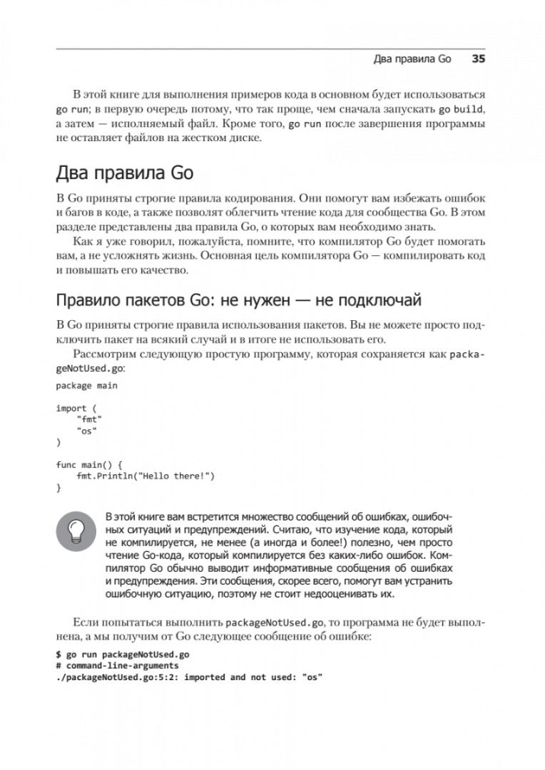 ОписаниеВам уже знакомы основы языка Go? В таком случае эта книга для вас. Михалис Цукалос продемонстрирует возможности языка, даст понятные и простые объяснения, приведет примеры и предложит эффективные паттерны программирования.Изучая нюансы Go, вы освоите типы и структуры данных языка, а также работу с пакетами, конкурентность, сетевое программирование, устройство компиляторов, оптимизацию и многое другое. Закрепить новые знания помогут материалы и упражнения в конце каждой главы.Уникальным материалом станет глава о машинном обучении на языке Go, в которой вы пройдёте от основополагающих статистических приемов до регрессии и кластеризации. Вы изучите классификацию, нейронные сети и приёмы выявления аномалий. Из прикладных разделов вы узнаете: как использовать Go с Docker и Kubernetes, Git, WebAssembly, JSON и др.2-е издание.Вам уже знакомы основы языка Go? В таком случае эта книга для вас. Михалис Цукалос продемонстрирует возможности языка, даст понятные и простые объяснения, приведет примеры и предложит эффективные паттерны программирования.Изучая нюансы Go, вы освоите типы и структуры данных языка, а также работу с пакетами, конкурентность, сетевое программирование, устройство компиляторов, оптимизацию и многое другое. Закрепить новые знания помогут материалы и упражнения в конце каждой главы.Уникальным материалом станет глава о машинном обучении на языке Go, в которой вы пройдёте от основополагающих статистических приемов до регрессии и кластеризации. Вы изучите классификацию, нейронные сети и приёмы выявления аномалий. Из прикладных разделов вы узнаете: как использовать Go с Docker и Kubernetes, Git, WebAssembly, JSON и др.2-е издание.