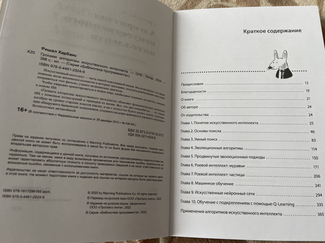 ОписаниеИскусственный интеллект - часть нашей повседневной жизни. Мы встречаемся с его проявлениями, когда занимаемся шопингом в интернет-магазинах, получаем рекомендации "вам может понравиться этот фильм", узнаем медицинские диагнозы… Чтобы уверенно ориентироваться в новом мире, необходимо понимать алгоритмы, лежащие в основе ИИ."Грокаем алгоритмы искусственного интеллекта" объясняет фундаментальные концепции ИИ с помощью иллюстраций и примеров из жизни. Все, что вам понадобится, - это знание алгебры на уровне старших классов школы, и вы с легкостью будете решать задачи, позволяющие обнаружить банковских мошенников, создавать шедевры живописи и управлять движением беспилотных автомобилей.Искусственный интеллект - часть нашей повседневной жизни. Мы встречаемся с его проявлениями, когда занимаемся шопингом в интернет-магазинах, получаем рекомендации "вам может понравиться этот фильм", узнаем медицинские диагнозы… Чтобы уверенно ориентироваться в новом мире, необходимо понимать алгоритмы, лежащие в основе ИИ."Грокаем алгоритмы искусственного интеллекта" объясняет фундаментальные концепции ИИ с помощью иллюстраций и примеров из жизни. Все, что вам понадобится, - это знание алгебры на уровне старших классов школы, и вы с легкостью будете решать задачи, позволяющие обнаружить банковских мошенников, создавать шедевры живописи и управлять движением беспилотных автомобилей.