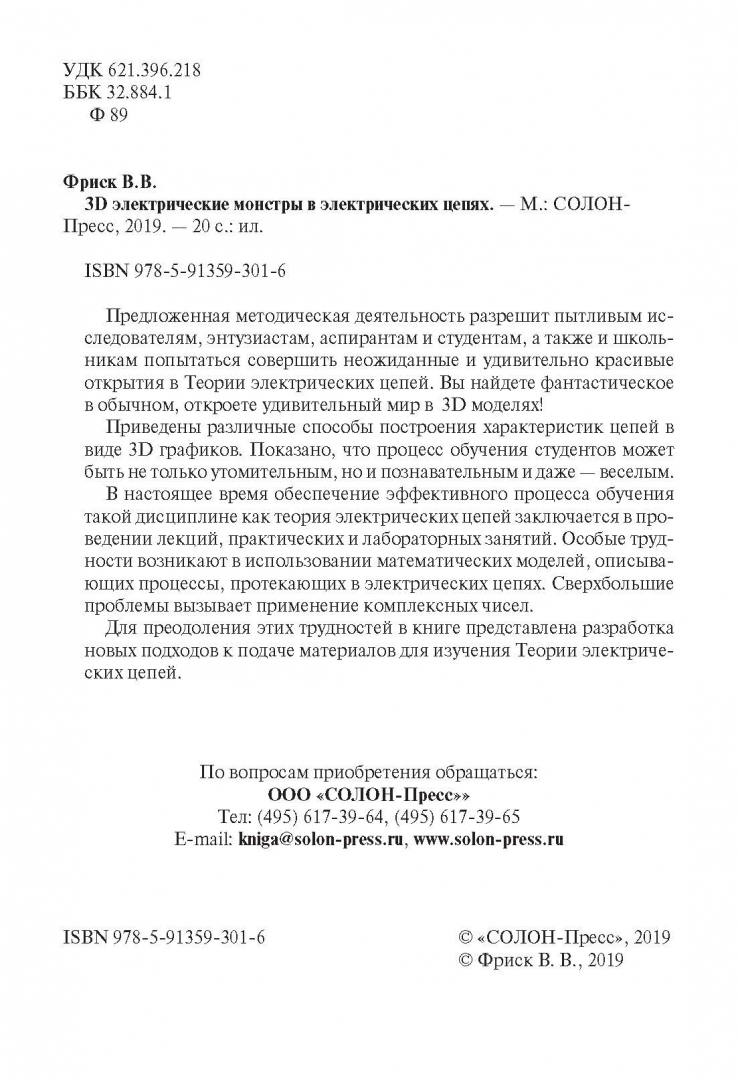 ОписаниеПредложенная методическая деятельность, представленная в данном полноцветном издании, разрешит пытливым исследователям, энтузиастам, аспирантам и студентам, а также и школьникам попытаться совершить неожиданные и удивительно красивые открытия в Теории электрических цепей. Вы найдете фантастическое в обычном, откроете удивительный мир в цветных 3D моделях!Приведены различные способы построения характеристик цепей в виде 3D графиков. Показано, что процесс обучения студентов может быть не только утомительным, но и познавательным и даже - веселым.В настоящее время обеспечение эффективного процесса обучения такой дисциплине как теория электрических цепей заключается в проведении лекций, практических и лабораторных занятий. Особые трудности возникают в использовании математических моделей, описывающих процессы, протекающих в электрических цепях. Сверхбольшие проблемы вызывает применение комплексных чисел.Для преодоления этих трудностей в книге представлена разработка новых подходов к подаче материалов для изучения Теории электрических цепей.СвернутьПредложенная методическая деятельность, представленная в данном полноцветном издании, разрешит пытливым исследователям, энтузиастам, аспирантам и студентам, а также и школьникам попытаться совершить неожиданные и удивительно красивые открытия в Теории электрических цепей. Вы найдете фантастическое в обычном, откроете удивительный мир в цветных 3D моделях!Приведены различные способы построения характеристик цепей в виде 3D графиков. Показано, что процесс обучения студентов может быть не только утомительным, но и познавательным и даже - веселым.В настоящее время обеспечение эффективного процесса обучения такой дисциплине как теория электрических цепей заключается в проведении лекций, практических и лабораторных занятий. Особые трудности возникают в использовании математических моделей, описывающих процессы, протекающих в электрических цепях. Сверхбольшие проблемы вызывает применение комплексных чисел.Для преодоления этих трудностей в книге представлена разработка новых подходов к подаче материалов для изучения Теории электрических цепей.СвернутьСвернуть