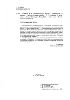 ОписаниеРассматриваются основные термины и положения, отраженные в стандартах группы "Статистические методы", отмечена роль статистических методов в управлении качеством и в повышении конкурентоспособности продукции. Рассмотрены теоретические основы статистических методов, методы статического приемочного контроля, семь простых инструментов качества, довольно подробно выполнен анализ контрольных карт Шухарта, приведена методика оценки возможностей технологических процессов, рассмотрено использование методов статистического приемочного контроля по альтернативному признаку.Пособие предназначено для учащихся среднетехнических учебных заведений, обучающихся по специальностям "Техническое регулирование и управление качеством" и "Управление качеством продукции, процессов и услуг (по отраслям)".Рассматриваются основные термины и положения, отраженные в стандартах группы "Статистические методы", отмечена роль статистических методов в управлении качеством и в повышении конкурентоспособности продукции. Рассмотрены теоретические основы статистических методов, методы статического приемочного контроля, семь простых инструментов качества, довольно подробно выполнен анализ контрольных карт Шухарта, приведена методика оценки возможностей технологических процессов, рассмотрено использование методов статистического приемочного контроля по альтернативному признаку.Пособие предназначено для учащихся среднетехнических учебных заведений, обучающихся по специальностям "Техническое регулирование и управление качеством" и "Управление качеством продукции, процессов и услуг (по отраслям)".