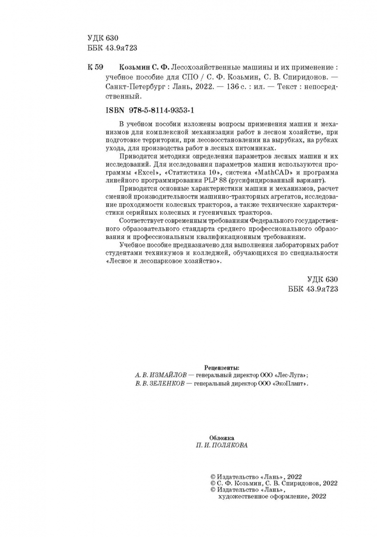 -Козьмин, Спиридонов: Лесохозяйственные машины и их применение. Учебное пособие для СПОМашиностроение. ПриборостроениеЭнергетикаГорная промышленность. МеталлургияЛегкая промышленностьПолиграфияРемонт бытовых приборовРобототехника и контроллерыАвтоматика. Вычислительная техникаПищевая промышленностьЭлектротехника. ЭлектроникаМетрология, стандартизация и сертификацияСтроительство. Коммунальное хозяйство